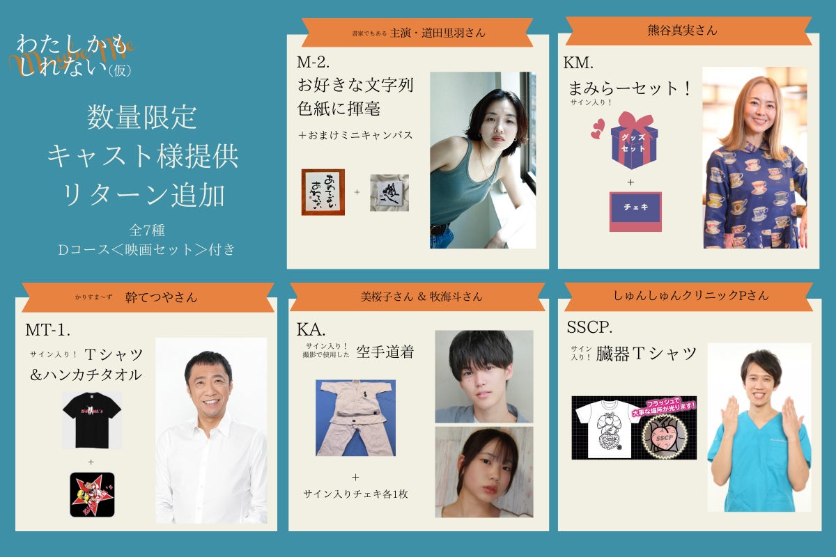 主人公の父・深山賢二役を演じるかりすま~ずの幹てつやさんからは、お笑いコンビ・かりすま~ずのオリジナルグッズにサインを入れてご提供いただきます。Tシャツはサイズ選択が可能です。<各10,000円、提供数:各1セット>