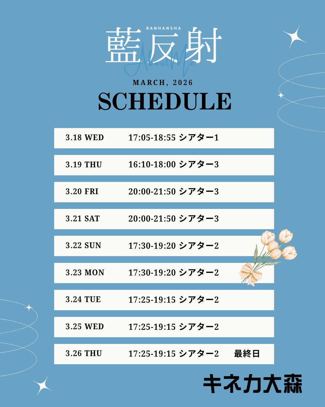 キネカ大森 上映スケジュール(予告編含め110分)