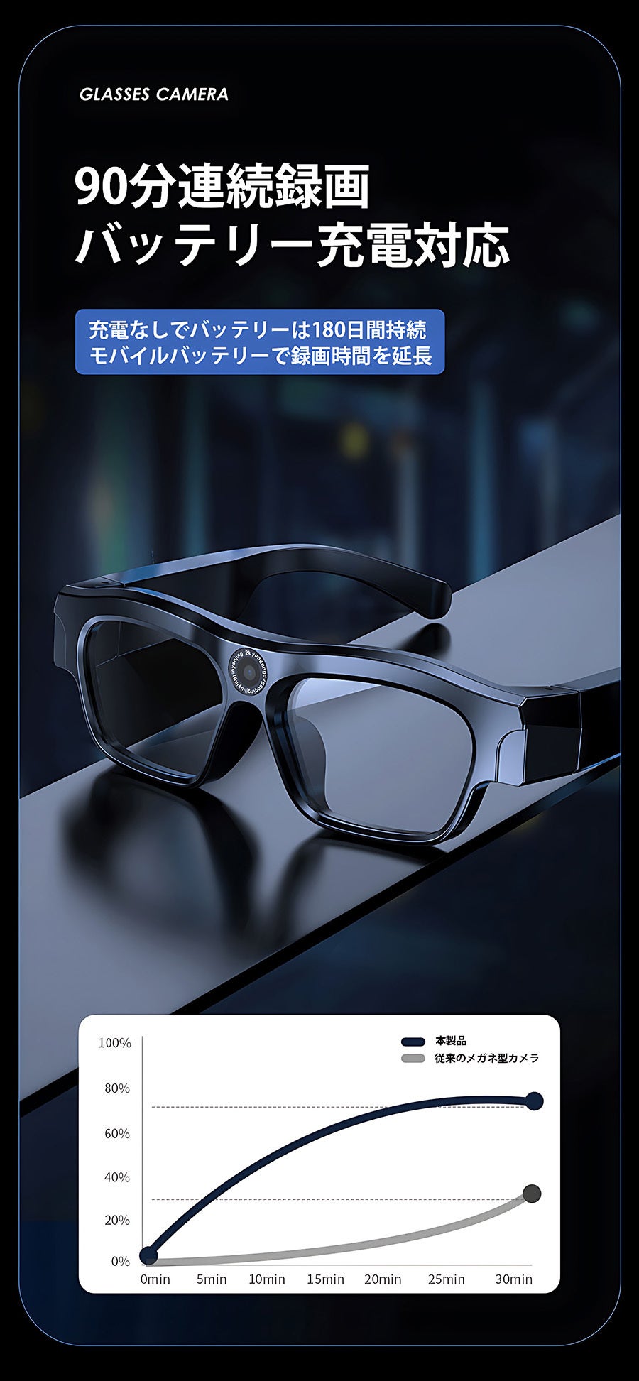 大容量バッテリー内蔵で最大90分の連続撮影が可能です。