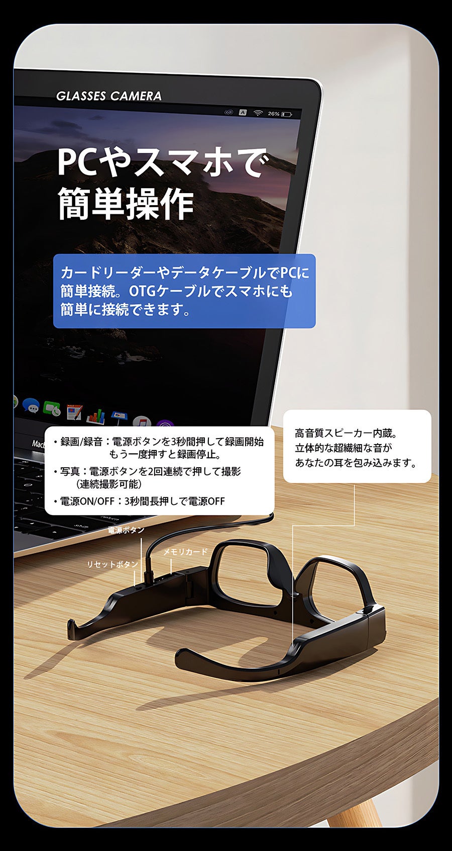 OTGケーブルやTFカードリーダーを使用することでPCやスマホで撮影した映像や画像を簡単に閲覧できます。