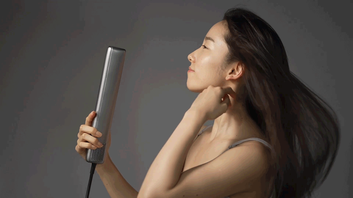 髪をボリュームダウンさせるには、毛流れと同じ方向に手ぐしを通し、上から下に温風をあててください。