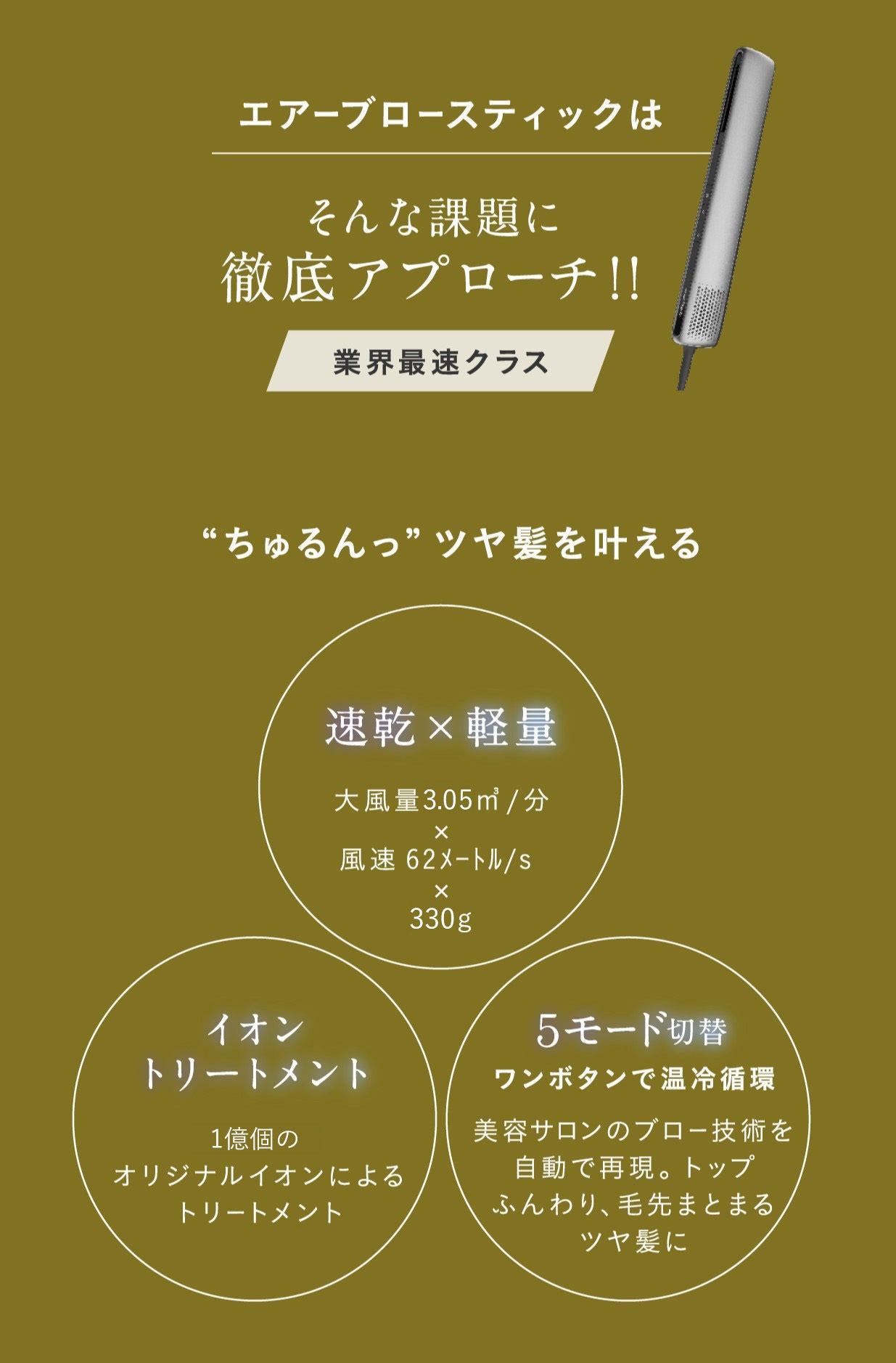 A.髪をボリュームアップさせるには、髪の根元を持ち上げ、下から上に温風をあててください。