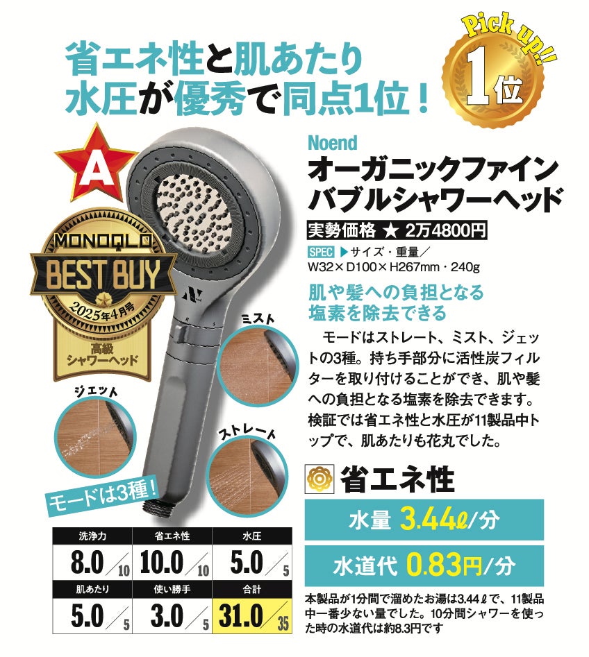 この度、『MONOQLO』*の厳正なテスト「省エネ性」「肌当たり」「水圧」の3項目で1位を獲得し、ベストバイを受賞しました。