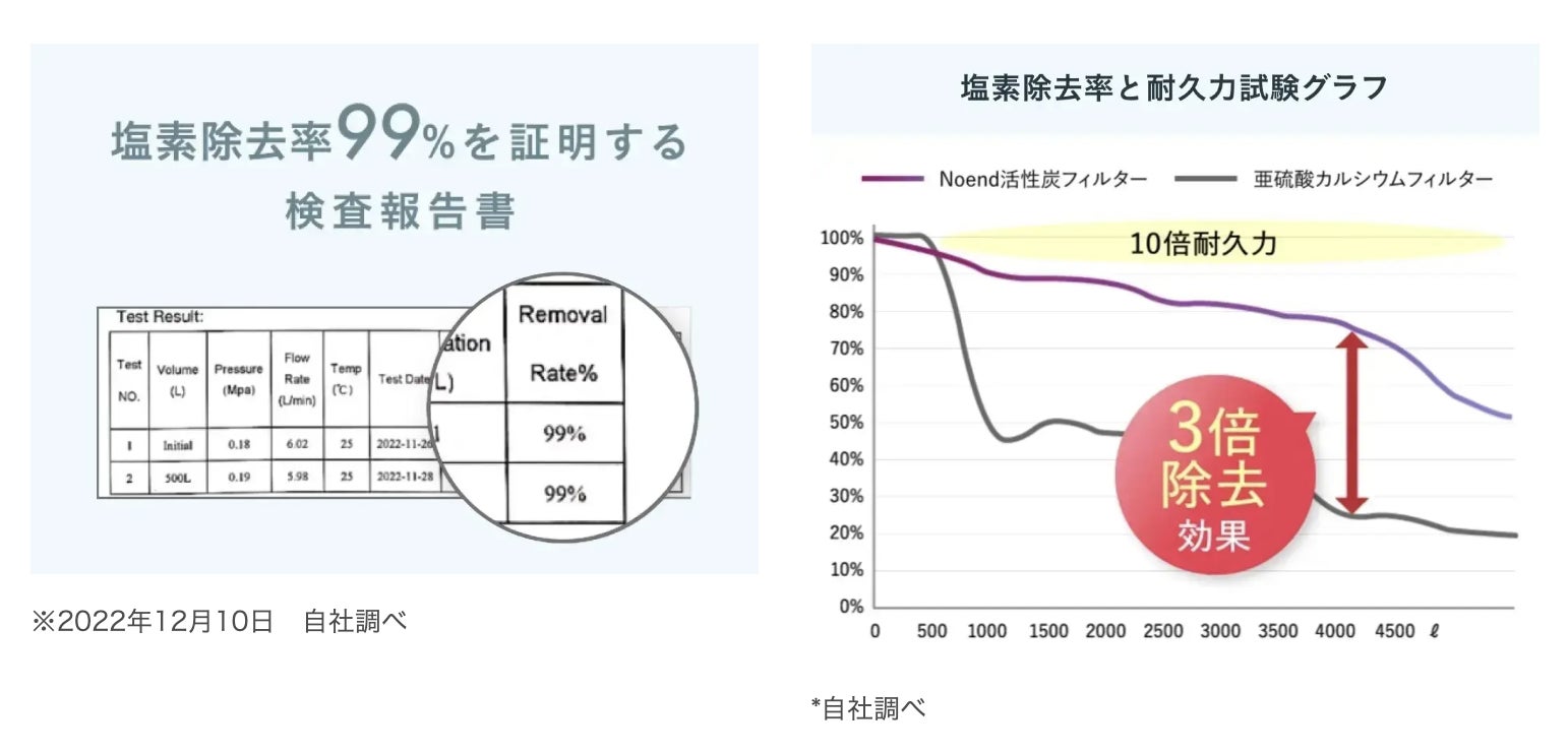最大76億個のオーガニックファインバブルが毛穴の奥の汚れをすっきり洗浄。また、肌や髪へのダメージの原因ともなる塩素を活性炭フィルターで99%*除去します。