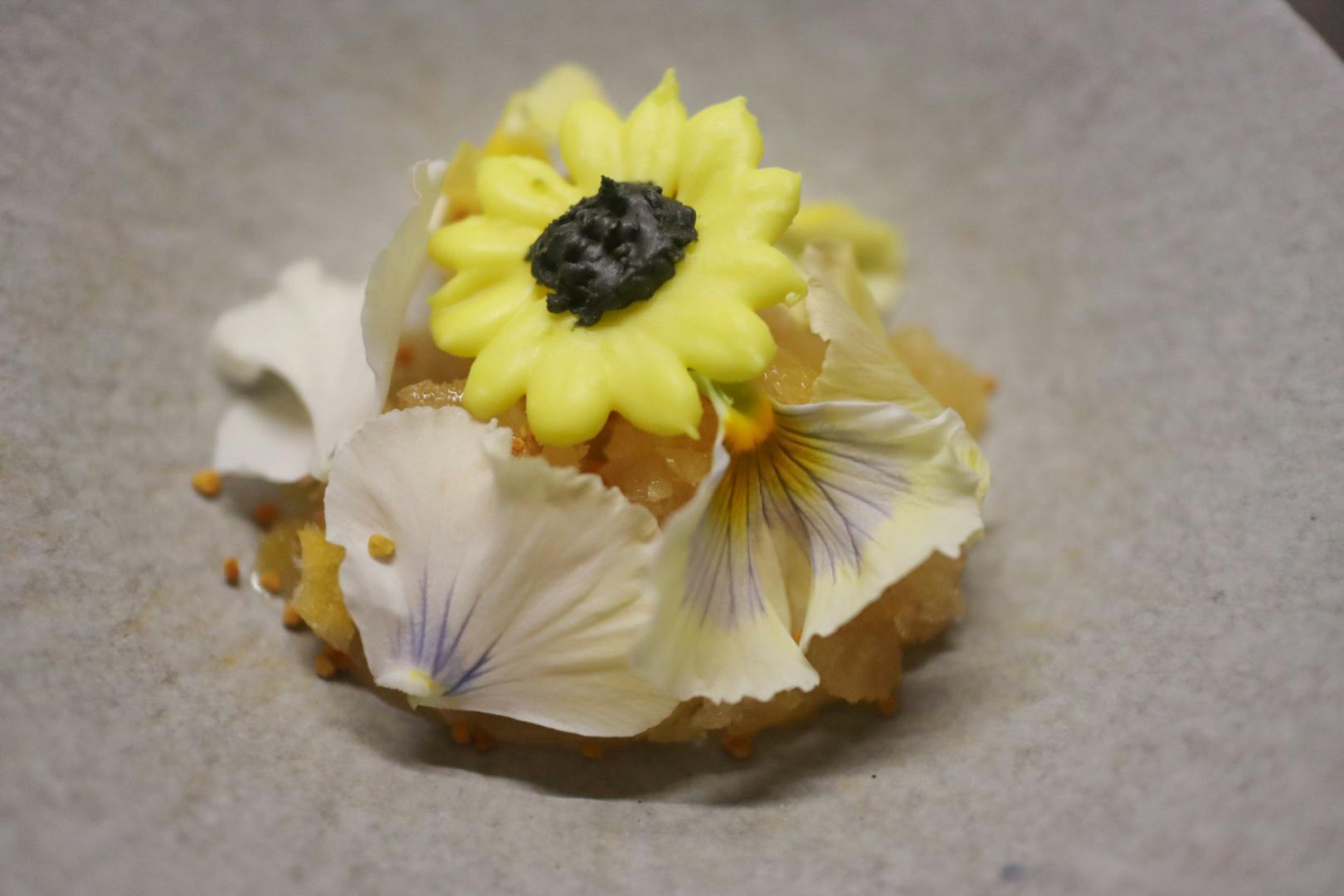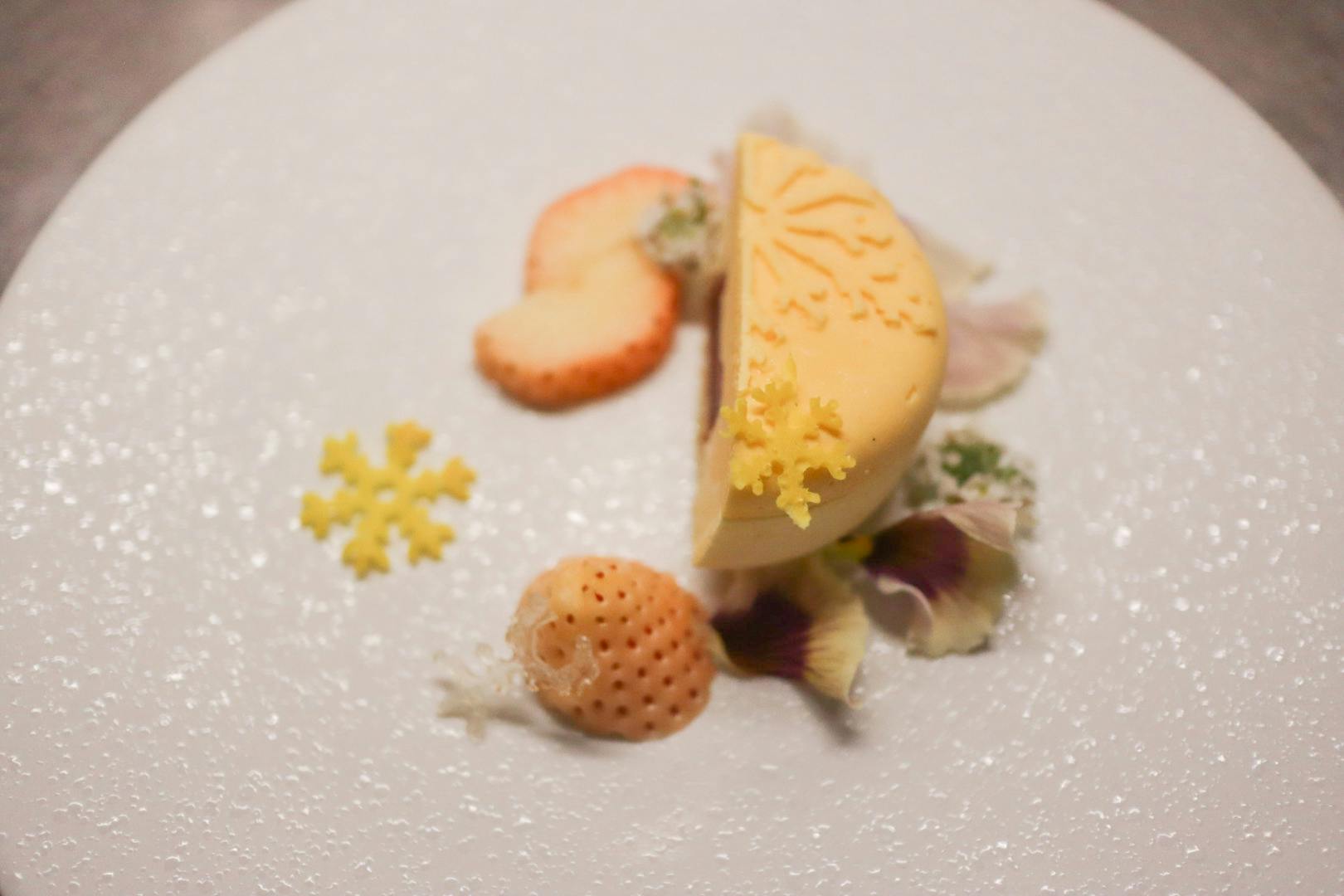 デザートは雪の結晶をモチーフとしたホワイトチョコのムース。
