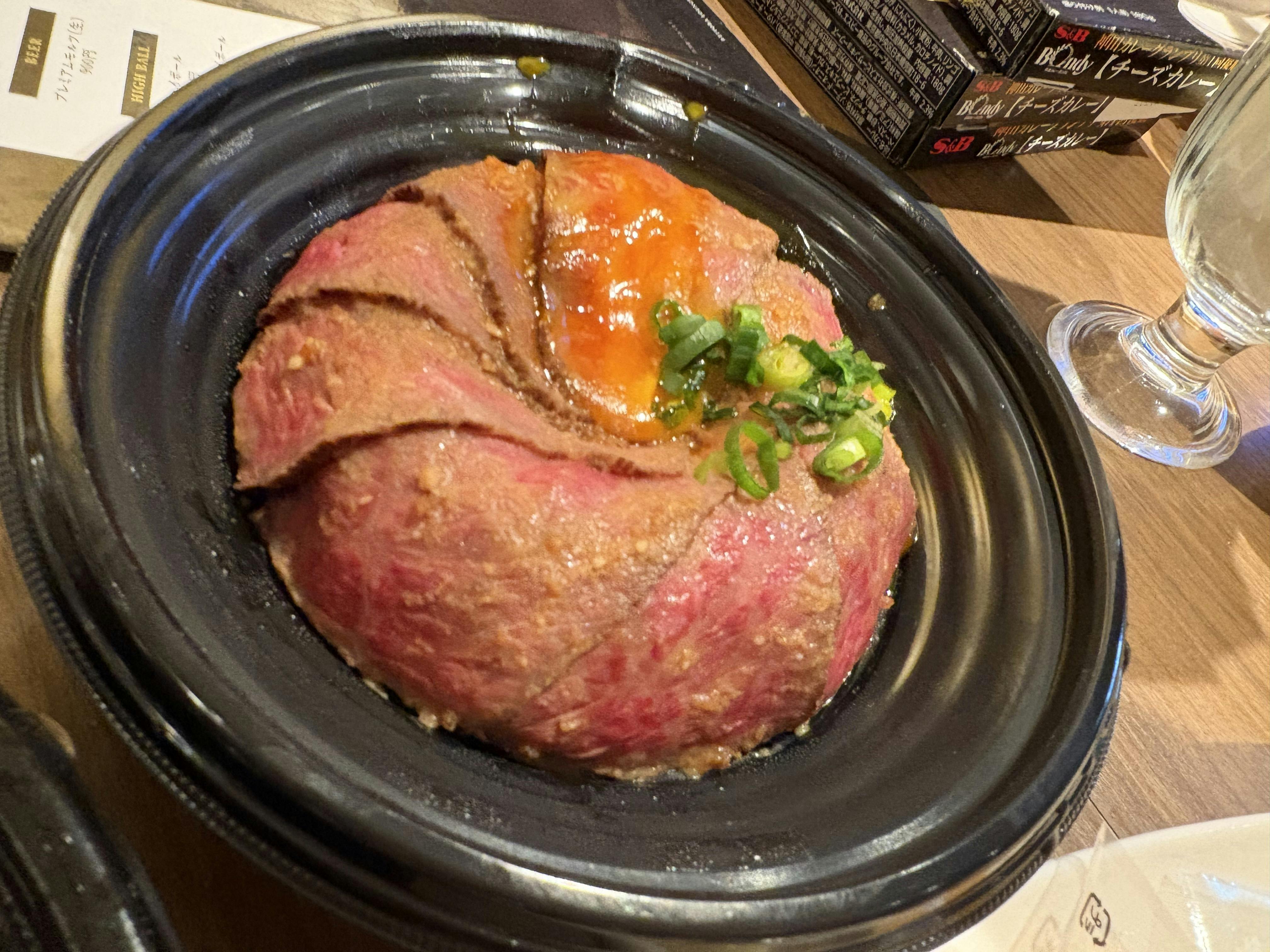 先日令和の虎グルメ部で「1500円でコスパがいいもの選手権」があったので、我々はたなひろさんのローストビーフ丼とステーキ丼を買っていきました。