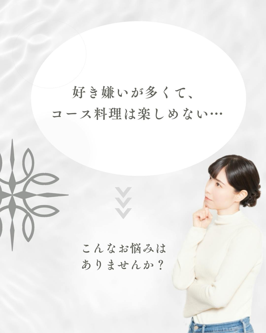 最近コムトゥヴに来てくれたお客様で、「苦手なものが多い奥様のためのコース」をリクエストされる方がいらっしゃったり、