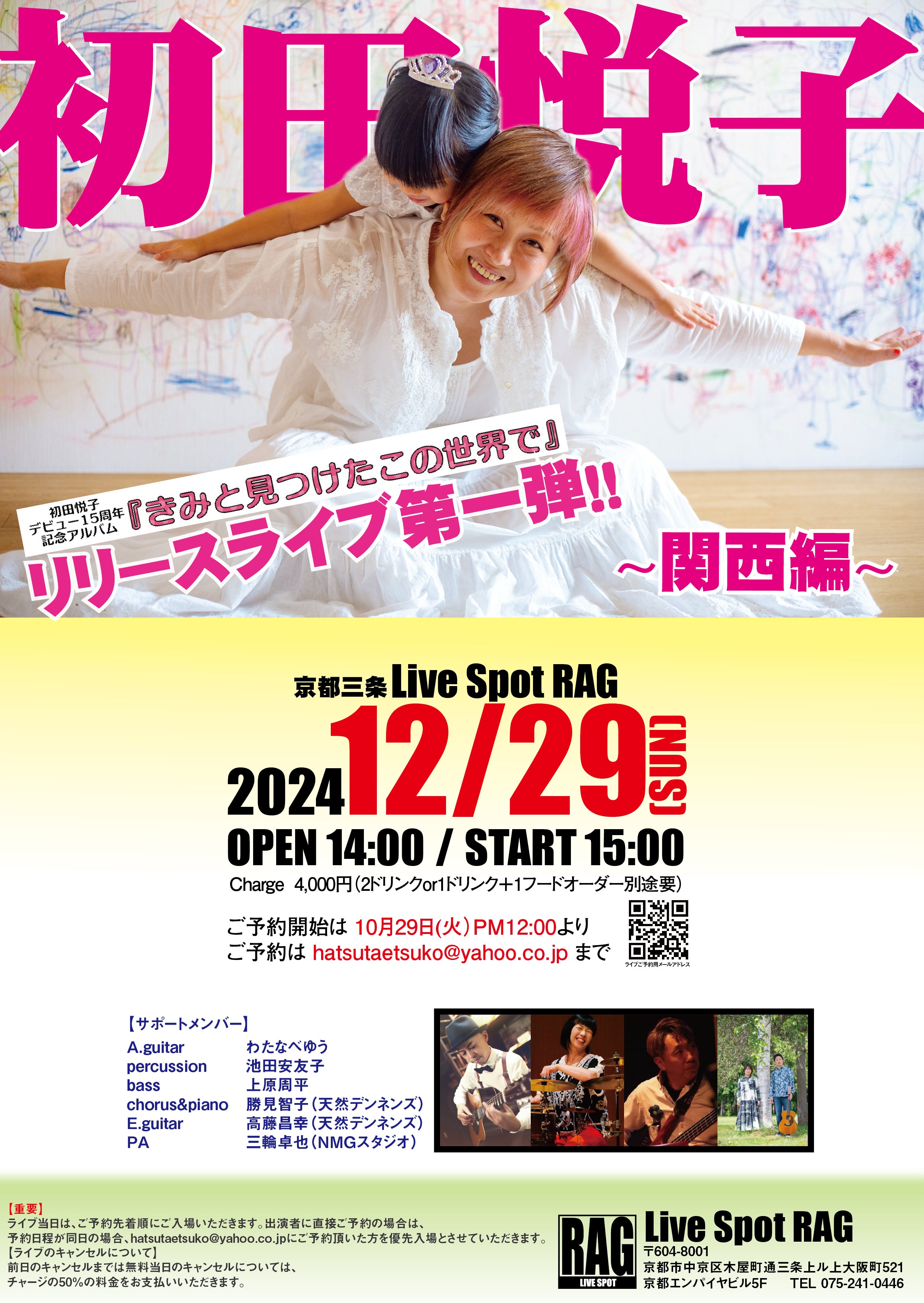 2024/10/28 19:35毎日ご支援の通知が届く、ありがたいラストスパートのここ数日。アルバムの発売日がまだ確定出来ないほどかなり拘って、制作を続けています。が!!とはいえ!!!11月末までにはリリースする!と心に決めて動いておりますので!!安心してください!!!!そんな中、リリースライブ第一弾 関西編、決定いたしました\(^o^)/年末も年末です!!!心の根っこから大好きなレコーディングメンバーと共に、レコーディングの小噺も交えつつ、ガツンとアルバム曲一気に放出しますので是非是非、お越しください!!クラファンはしてみたものの、初田悦子のライブは観たことないねんという方も、恐れずご予約くださいませ。2024年最後のライブに相応しい、愛と愉快と情熱に溢れかえったライブをお届けします^_^詳細2024年12月29日(日)@京都三条Live spot RAGㅤ初田悦子デビュー15周年記念アルバム「きみと見つけたこの世界で」リリースライブ第一弾 〜 関西編 〜 OPEN 14:00 / START 15:00ライブチャージ 4000円(2ドリンクor1ドリンク+1フードオーダー別途要)ㅤ【大忘年会詳細】開宴 18:00頃 / 終宴 20:00頃 ※ライブに来ていただいた方のみご参加いただけます。《忘年会費》1000円+飲食(ドリンク&お弁当)代※お飲み物は2ドリンク以上オーダーください。(ライブのドリンクとは別です)事前予約制のお弁当代 2000円(当日払い)気になるお弁当のお店は大山崎 ムーントークhttps://shops.saloon.jp/moontalk/afafafyaf/京都山科 タルタルクラブhttps://tartareclub.com ご予約時にどちらかの店名を明記してご注文下さい。※お一人で2店舗どちらのお弁当も食べたい方も大歓迎です!両方希望とご注文下さい!ご予約開始は明日10月29日 PM12:00よりㅤhatsutaetsuko@yahoo.co.jpㅤ上記アドレスまでお名前、ご予約人数、忘年会参加の方はお弁当のお店と個数をご明記の上、送信ください! もっと見る