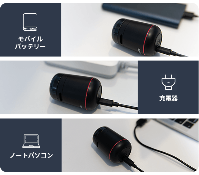 充電は本体のType-Cポートから行えます。コンセントから、またはモバイルバッテリーやノートパソコンから約1.5時間で充電完了です。