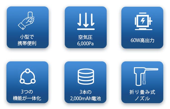 Y01は3種類のノズルヘッドが付属しており、エアダスター、真空ポンプ、空気入れとして使用可能です。家でもアウトドアでも、常備しておくと大変便利な1台です。