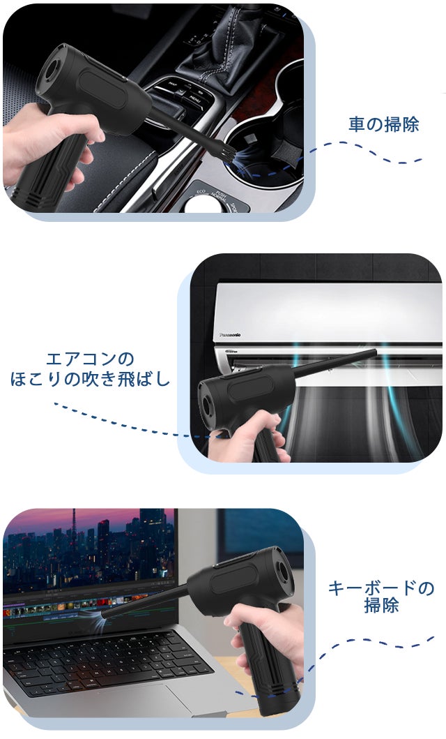 Y01は3種類のノズルヘッドが付属しており、エアダスター、真空ポンプ、空気入れとして使用可能です。家でもアウトドアでも、常備しておくと大変便利な1台です。
