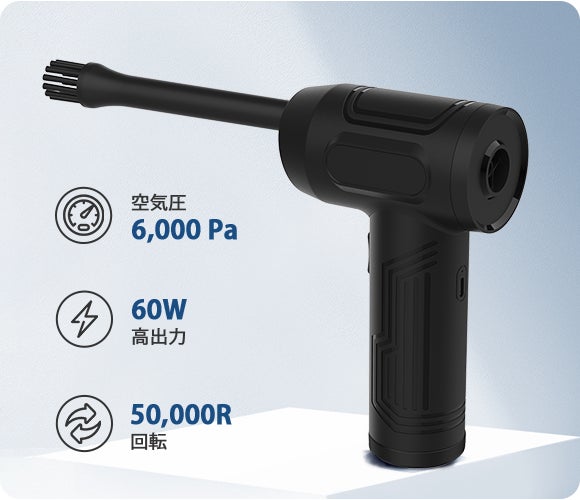 Y01は強力な風でゴミを吹き飛ばすだけでなく、便利な真空ポンプと空気入れがひとつになった多機能の電動エアダスターです。60Wの高出力、1分当たり250リットルの大風量で、部屋の隅に溜まったゴミやペットの毛、キーボードの隙間のほこりなどを吹き飛ばし、ピカピカに掃除できます。