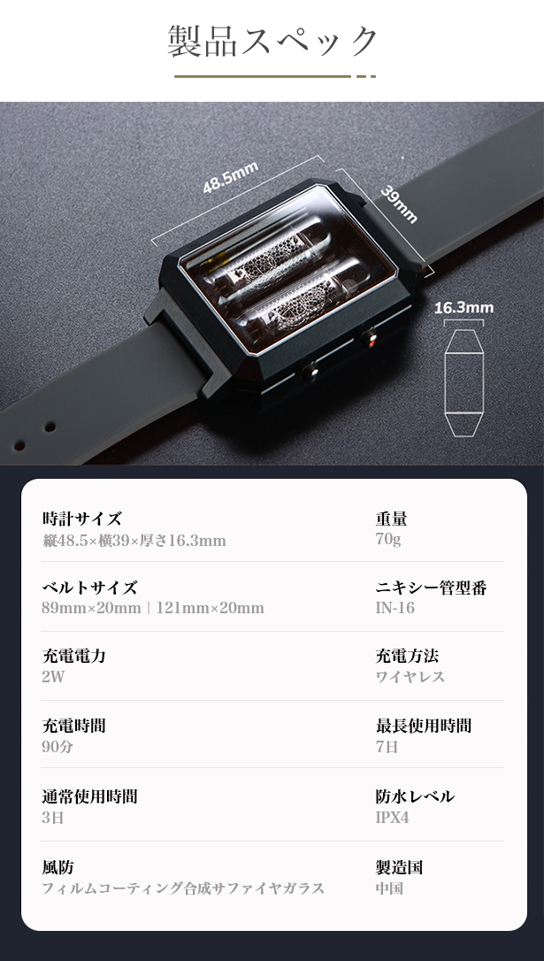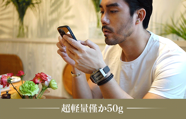時計部分は50gで、ちょうどよい重さを感じることができます。腕になじむデザインですので、快適な着け心地です。
