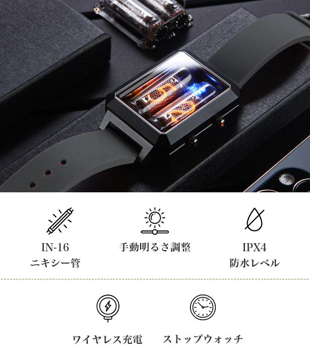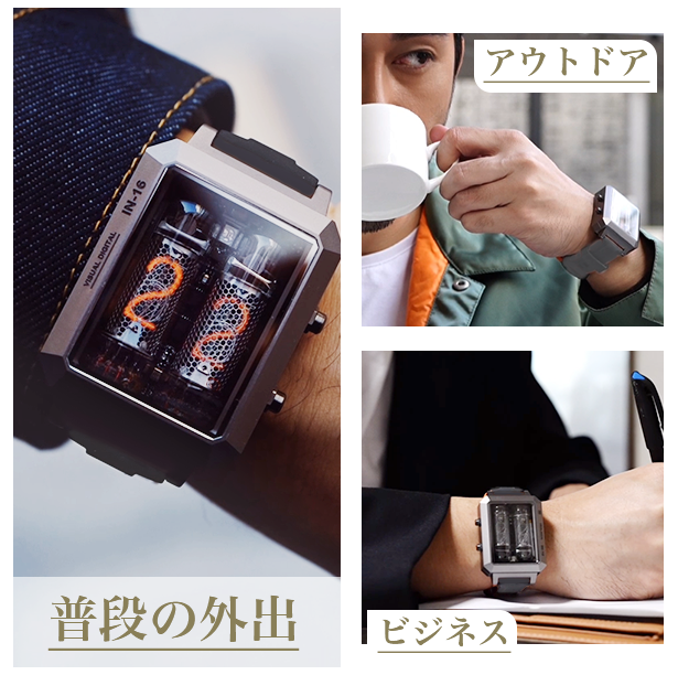 Era(エラ)は、レトロなニキシー管(IN-16)2本と現代の技術が融合したレトロでクールな腕時計です。スタルジックなニキシー管の文字盤が、注目を浴びること間違いなし。産業革命時代からやってきた色彩と光沢を、どうぞお楽しみください!