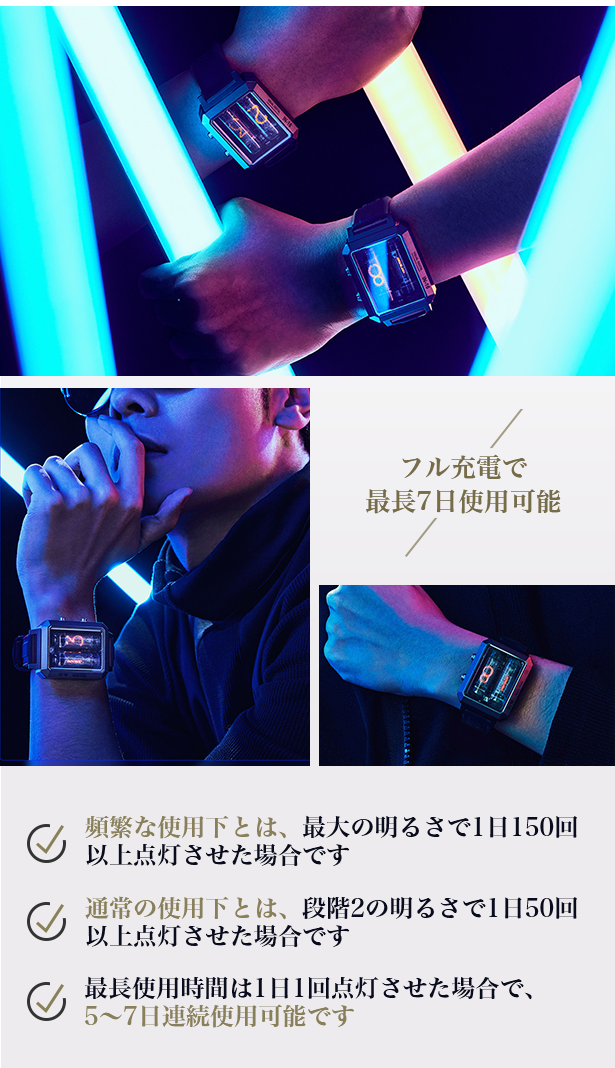 3時間でフル充電でき、通常の使用下では3日、頻繁な使用下では1日、最長で7日間使用できます。