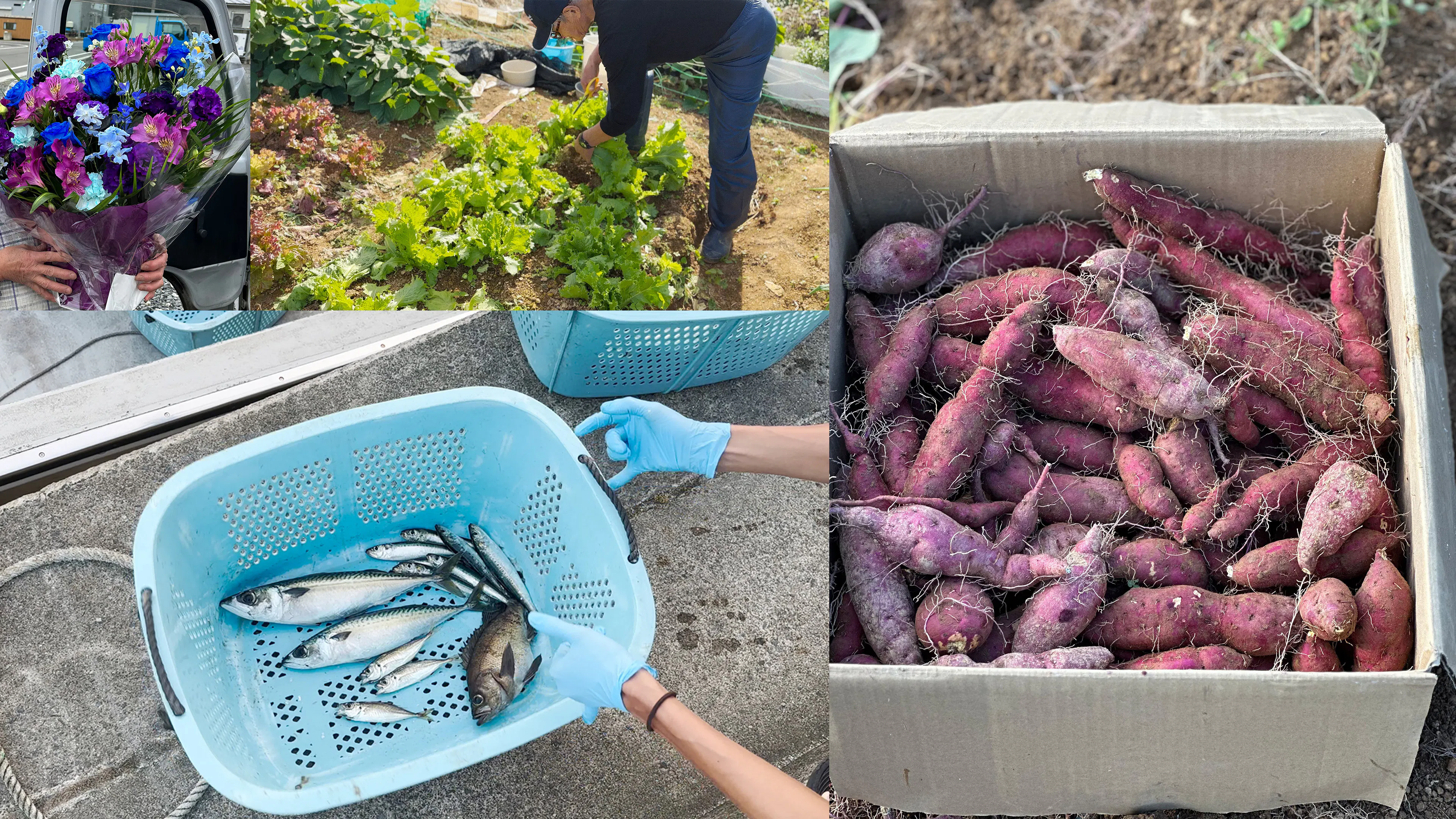 長期滞在して壁画制作をする中で、様々な住民の方から魚、果物、花、芋、など様々な贈り物、おすそわけをいただいてきました。自然豊かな海辺の町では見返りを求めず贈り合うという文化が今も残っていて、それは現代の都市生活が忘れてしまった心だと感じます。その文化、風土を伝える作品を構想しています。
