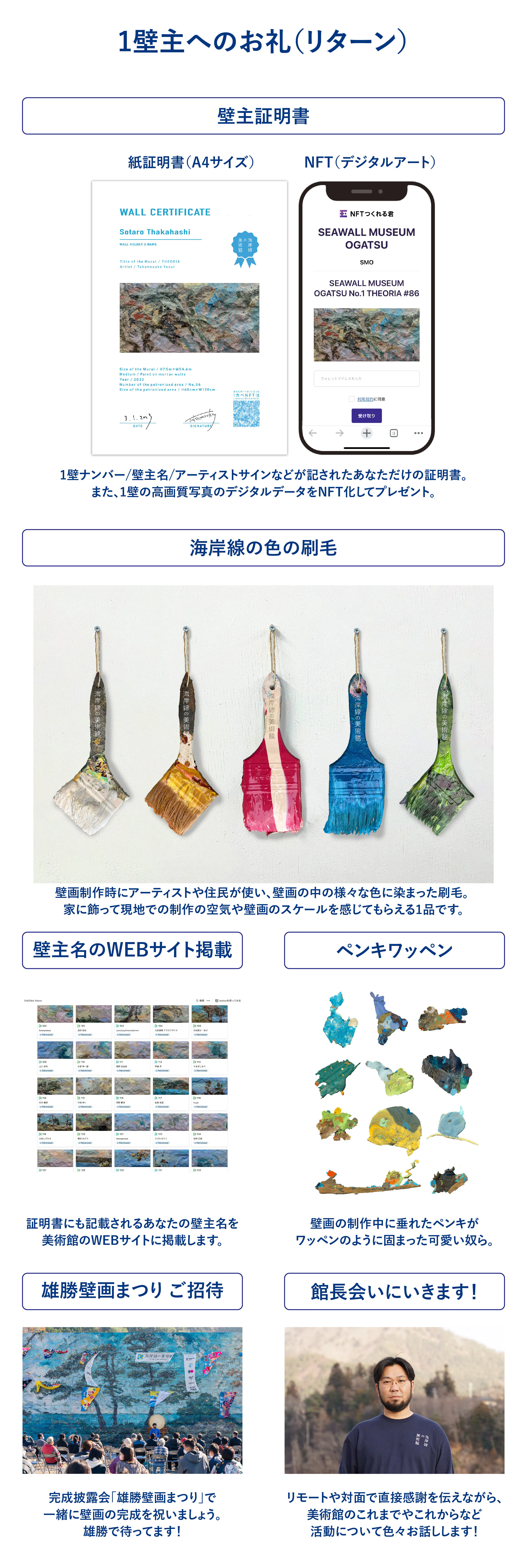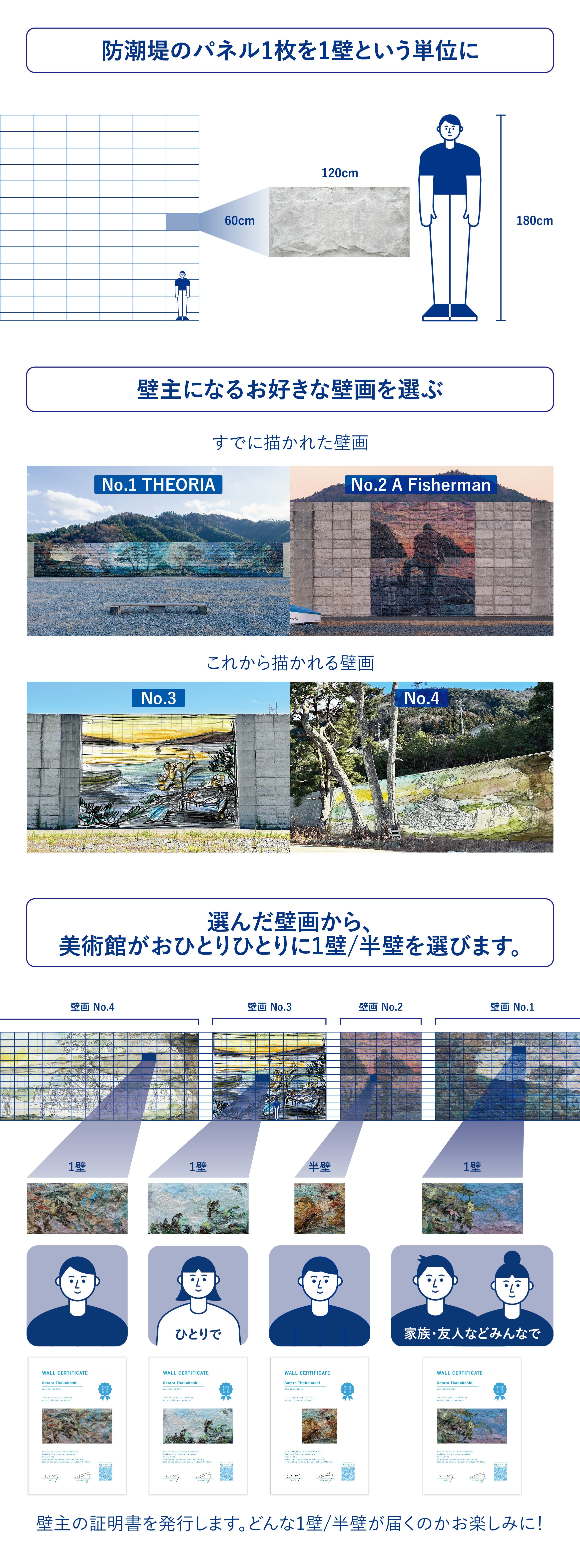 壁主になった方が雄勝に訪れ「自分の応援によって新しい風景が広がっていくんだ」と、第二の故郷のように感じて雄勝を好きになってもらう。アート好き、海好き、震災復興に興味がある方、地方創生や移住に興味がある方など、日本各地の様々な方々が雄勝の風景の共同壁主になることで新しい出会いや企みが生まれ、いい変化が起きることを期待しています。
