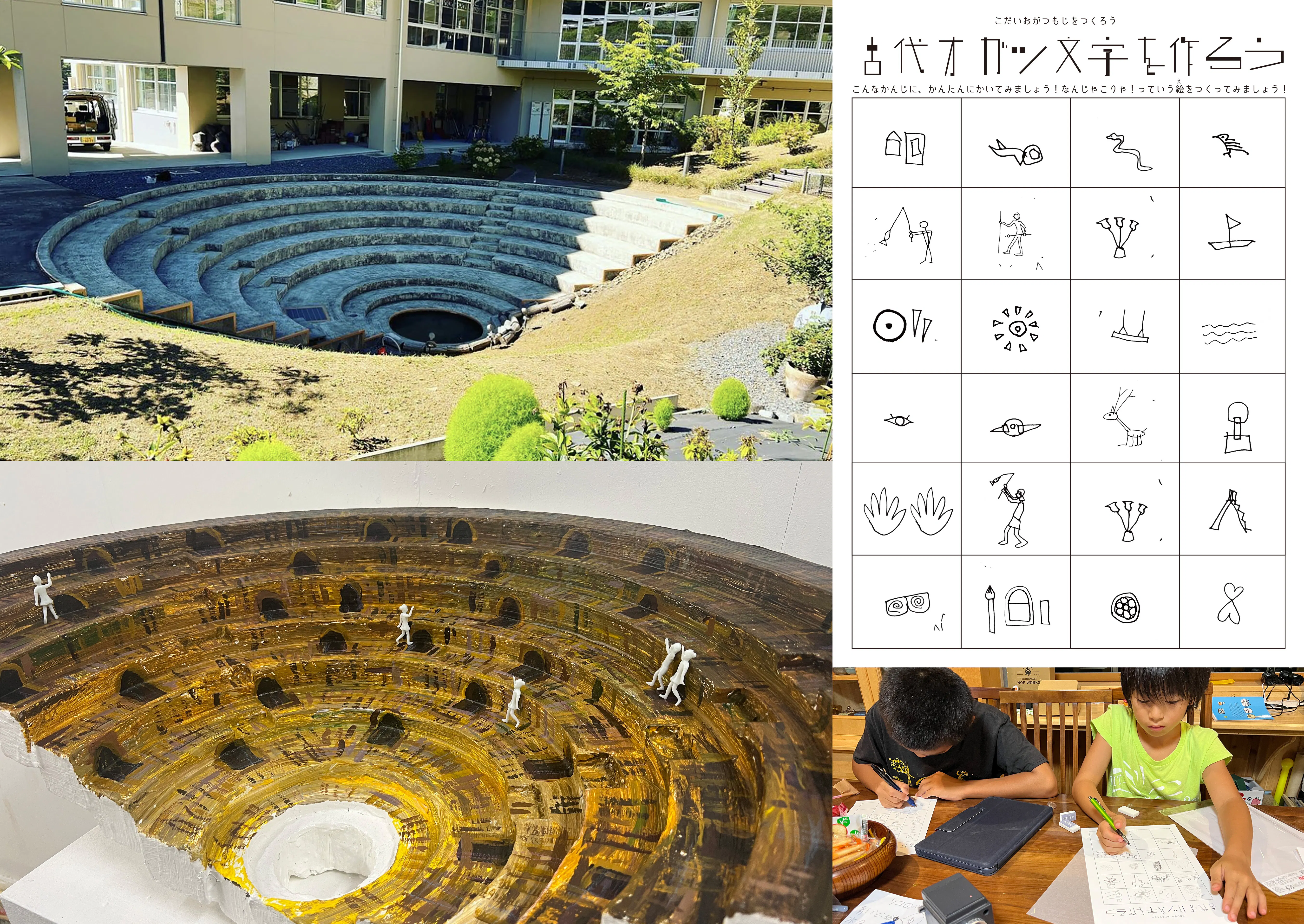 雄勝小中学校にある、円形階段に学校生徒と共同で地上絵を描くワークショップを開催。アーティストの安井鷹之介がインドで見たアジャンターケーブ遺跡を思い起こす形状の階段に、全校生徒31名ひとりずつに洞窟を描き、その中に子供たちが夏休みの宿題で考えてきてもらった「古代オガツ文字」を描いてもらいます。