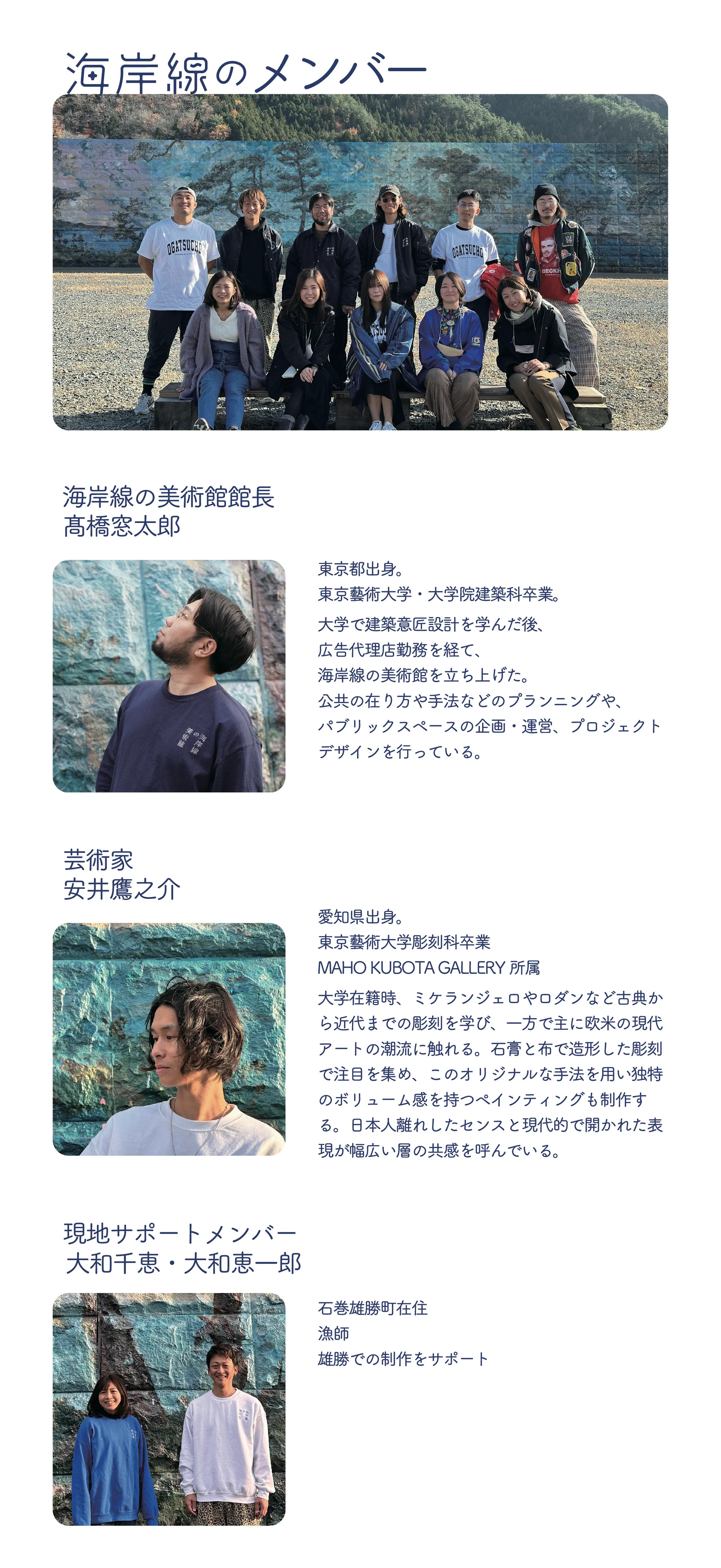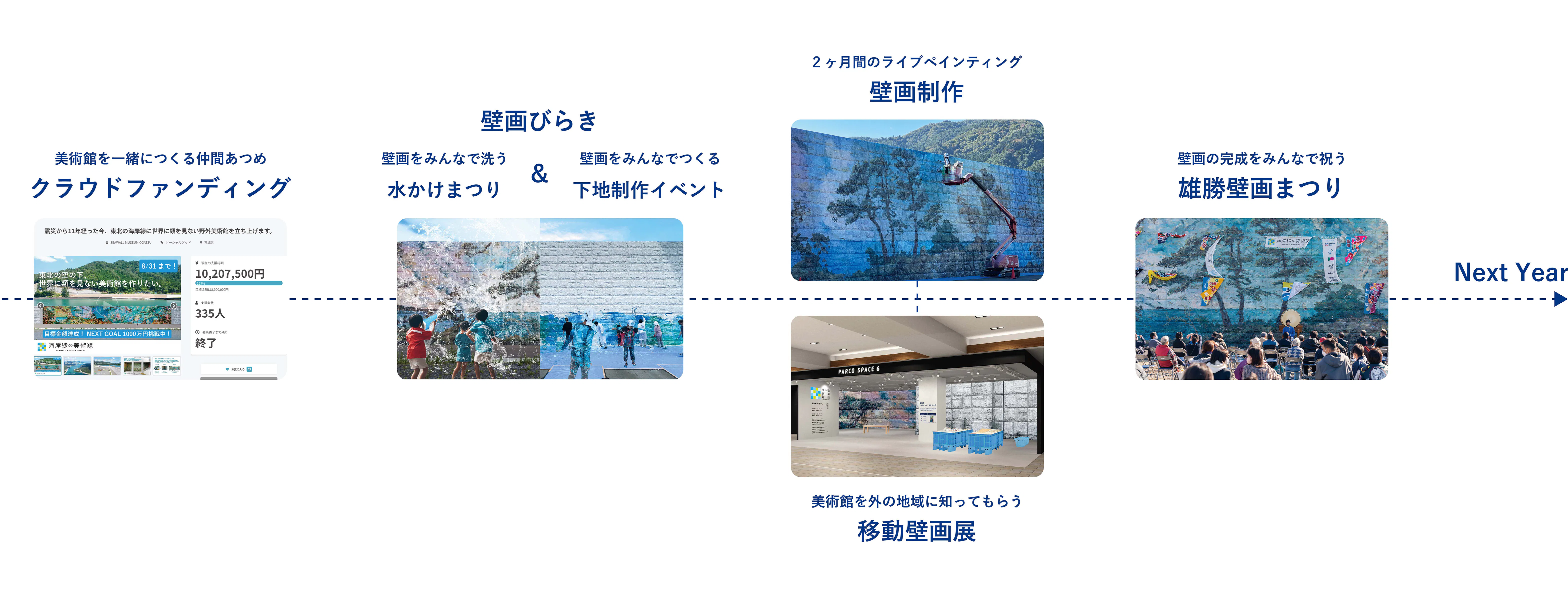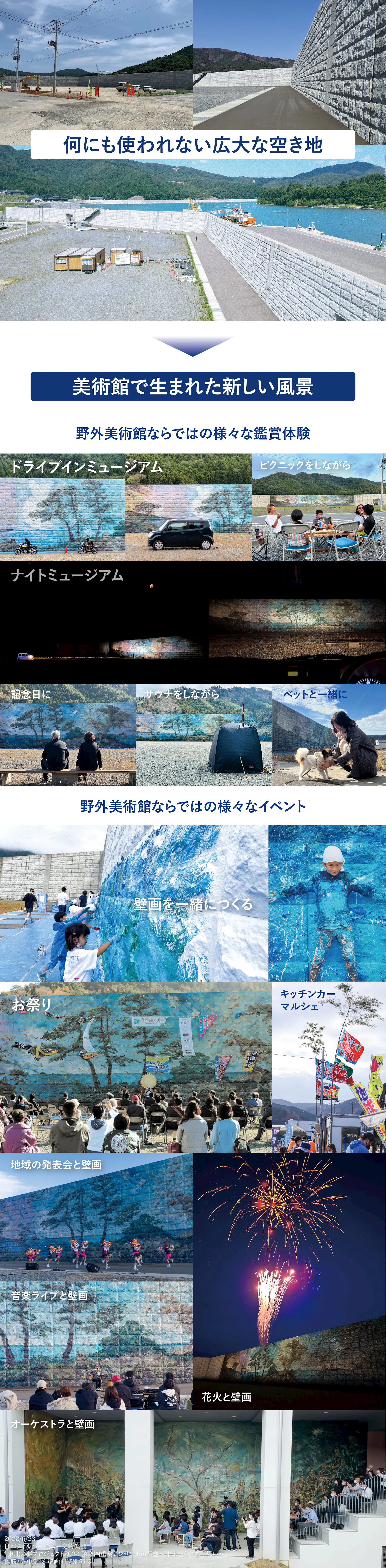 震災前にあった文化なども含め、過去・現在の雄勝の魅力を丁寧に見続けながら、その価値を未来に伝えていく壁画群を制作し、雄勝の魅力が詰まった「もうひとつの海岸線」である美術館を広げていきます。