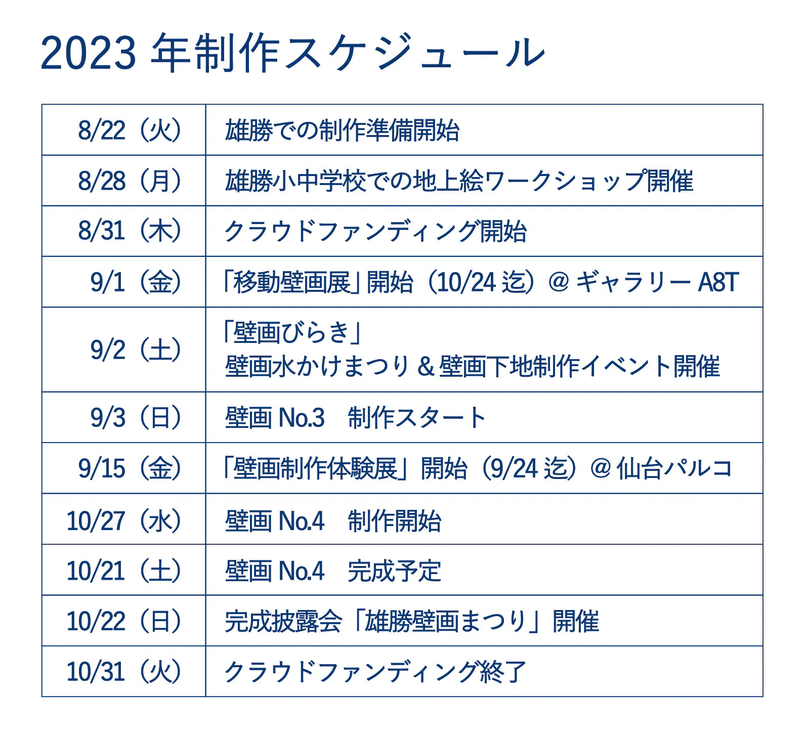 2023/10/24 11:4010/22(日)に、2023年に制作した壁画2作品のお披露目会として、「雄勝壁画まつり」を開催しました。当日は、県内外から約1000人ほどの方々が来場し、東北の文化である芋煮を雄勝verにアレンジした「雄勝海鮮芋煮」のお振る舞いや、壁画を背景にした音楽ライブ、高所作業車による天空壁画ツアー、キッチンカーやマルシェ、50mの壁画を走る50m走大会や靴飛ばし大会など住民と一緒に作り上げたお祭りを楽しんでいただきました。当日の様子を、仙台放送さんがまとめてくれていますので、ぜひご覧ください。https://news.yahoo.co.jp/articles/9d994e4fc78f6902f8444cc392bd9d8a01ff0484美術館の壁画は今年制作したものを含め6作品あります。壁画MAPを見ながら、壁画と雄勝・石巻の魅力を堪能しに是非宮城までお越しください!!!そして!!クラウドファンディングも、残り1週間となりました。現在目標金額の19%と厳しい状況ですが、今後美術館を続けていくための資金をできるだけ多く集めていきたいと思っています!ぜひ、一度見てもらえたら嬉しいです。そして、ぜひシェアしていただけたら嬉しいです。10/31迄です。クラファンページの冒頭で、プロジェクトを一緒に進めている住民さんや、館長である僕の思いを綴っています。ぜひ見てもらえたら嬉しいです。 もっと見る