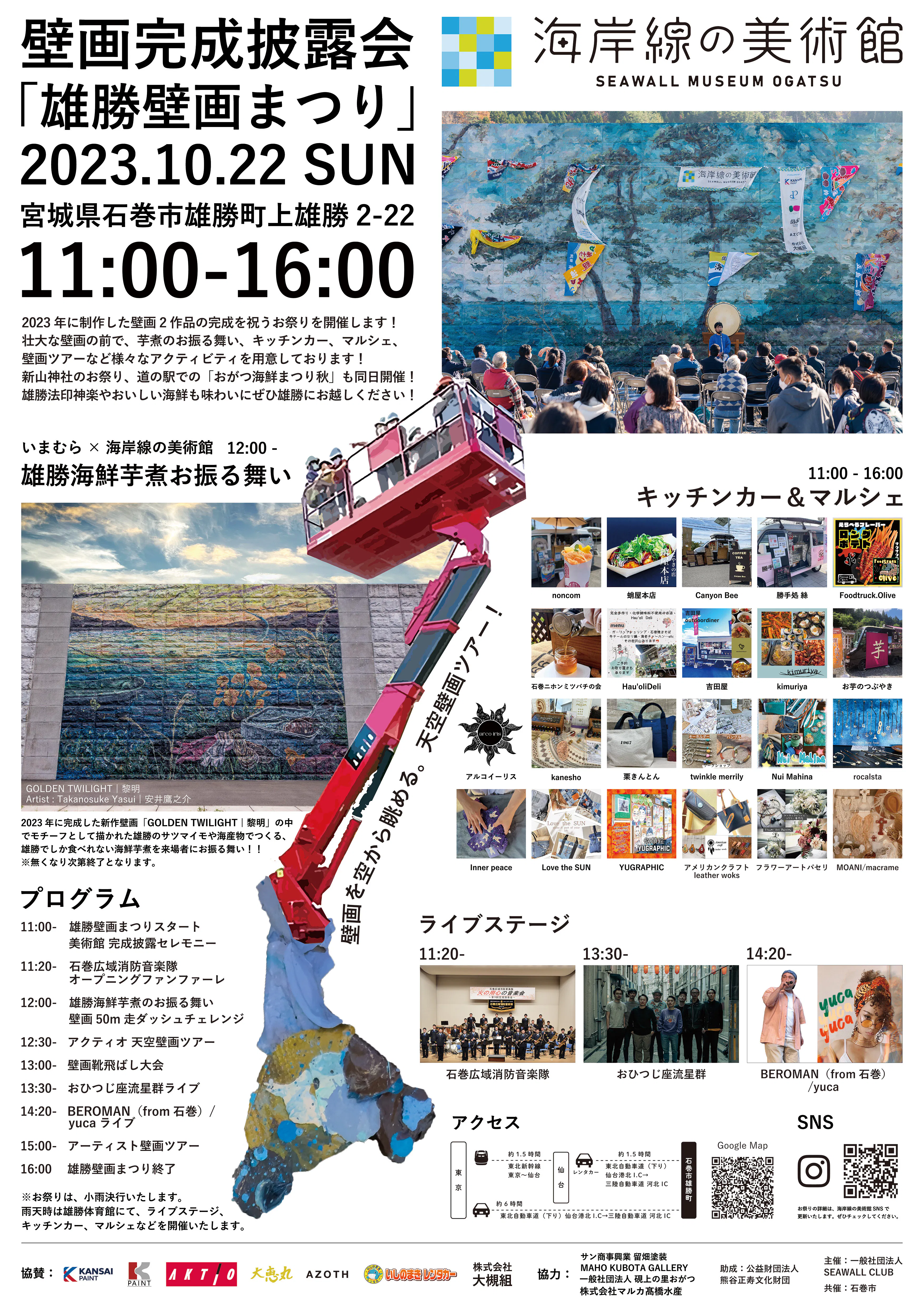 2023年に制作した壁画2作品の完成披露会として、お祭りを開催します。壮大な壁画の前で、キッチンカーやマルシェや様々なアクティビティを用意してお待ちしています!雄勝町の新山神社祭り、道の駅の海鮮祭りも同日開催予定です。雄勝法院神楽や海鮮を味わいに来てください!
