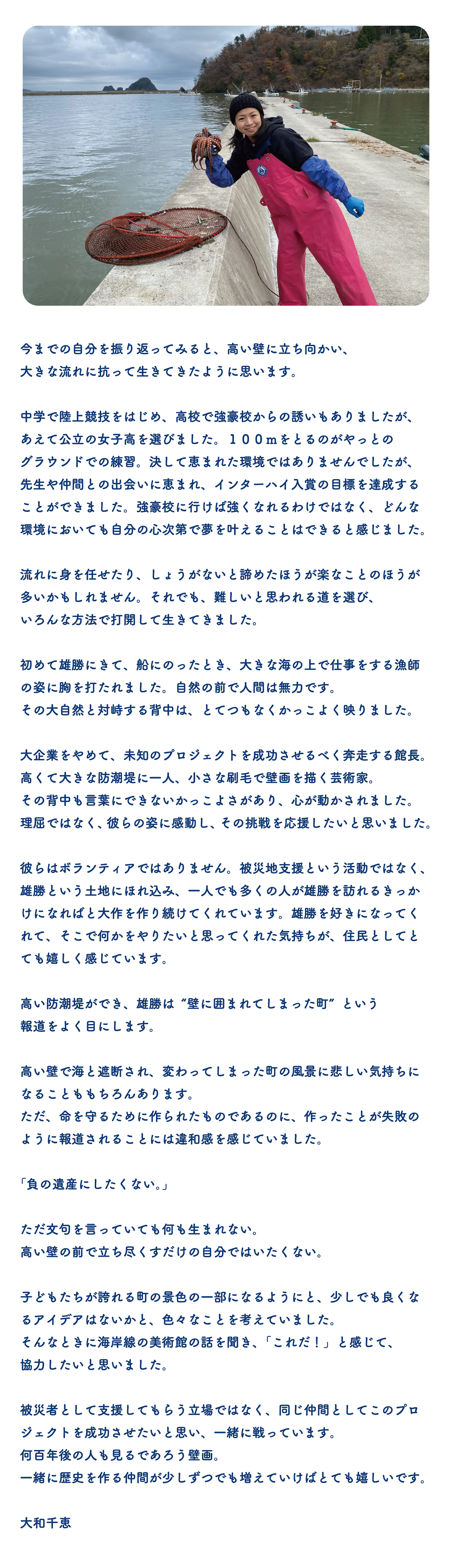 雄勝町の住民で海岸線の美術館に共感いただき一緒に進めている大和千恵(やまとちえ)さんの言葉から始めたいと思います。なぜ海岸線の美術館プロジェクトをしているのか、という想いがこめられています。
