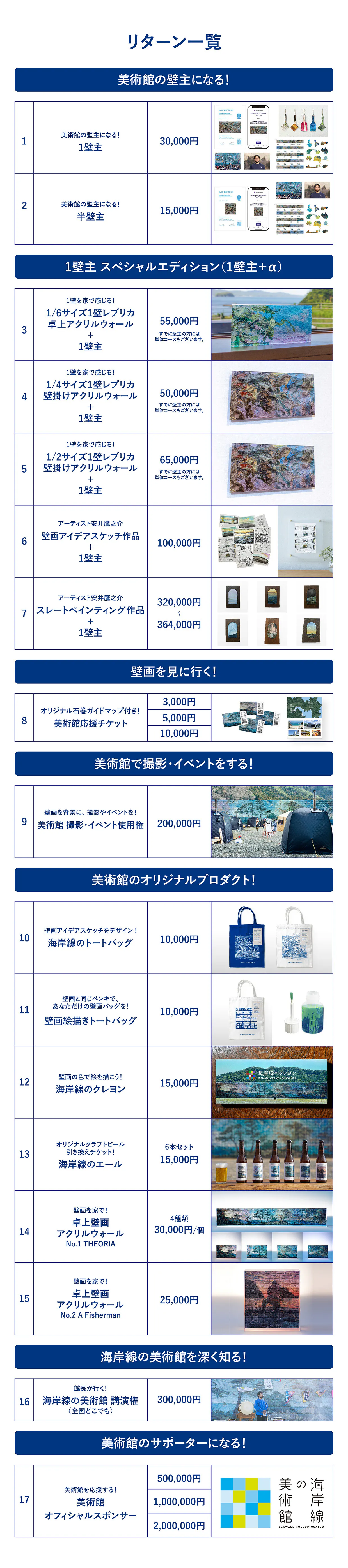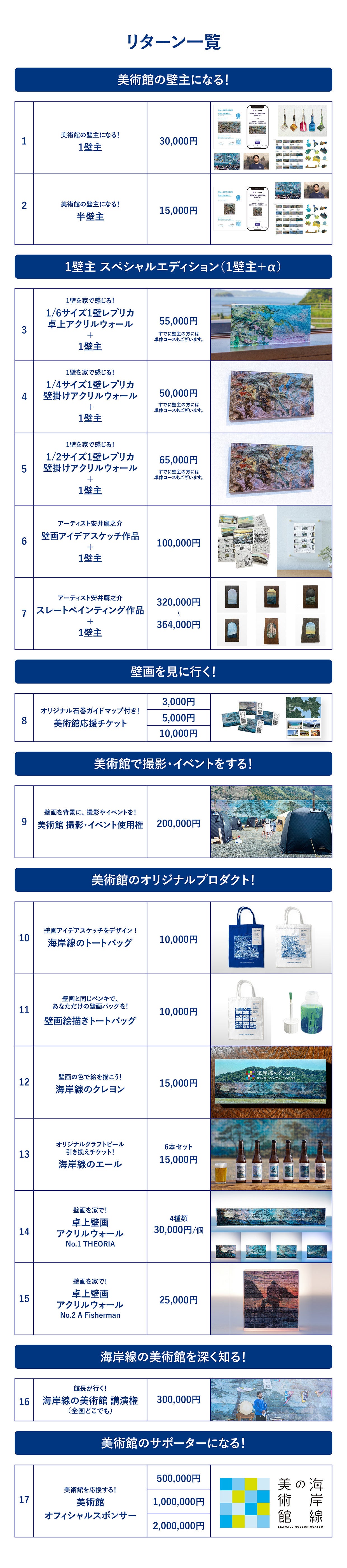 今回のクラウドファンディングでは、壁主のコースを基本に様々なコースをご用意しました。美術館ならではの、ものや体験などたくさん用意しましたので、ぜひリターンのラインナップをお楽しみください。