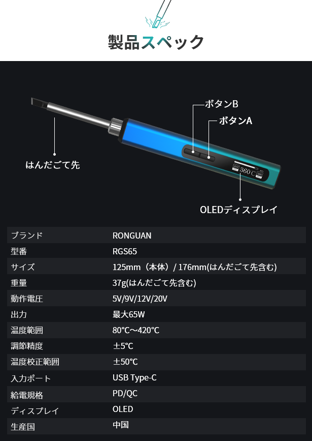 「 RGS65」はUSB Type-C給電対応のスマートはんだごてです。スマホやパソコンのアダプター、またはモバイルバッテリーに接続して給電できます。