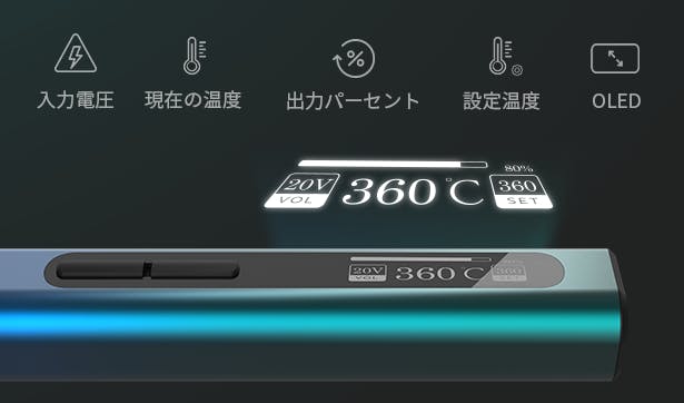 クリアで見やすいOLEDディスプレイを搭載。現在のはんだごて先の温度、設定温度、入力電圧、出力パーセントを表示して、動作状況が一目で分かります。