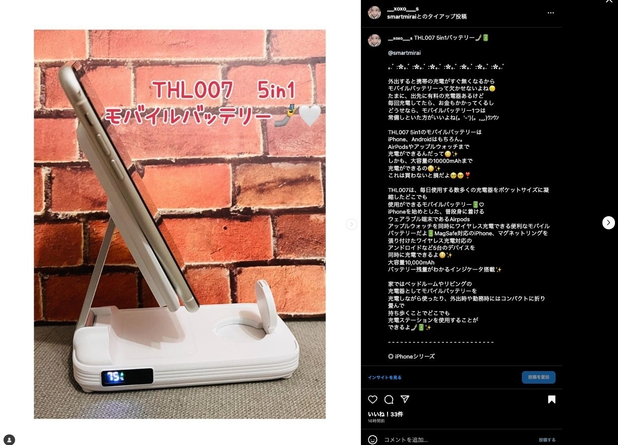 昨日よりインフルエンサーの方々による宣伝がスタートいたしました。弊社Instagramアカウントより投稿内容等確認していただけます!https://www.instagram.com/smartmirai/販売前サンプル品を使用していただき使用感等のチェック、宣伝をしていただいております。ぜひともご支援のほどよろしくお願いいたします。