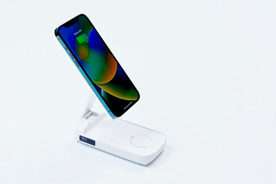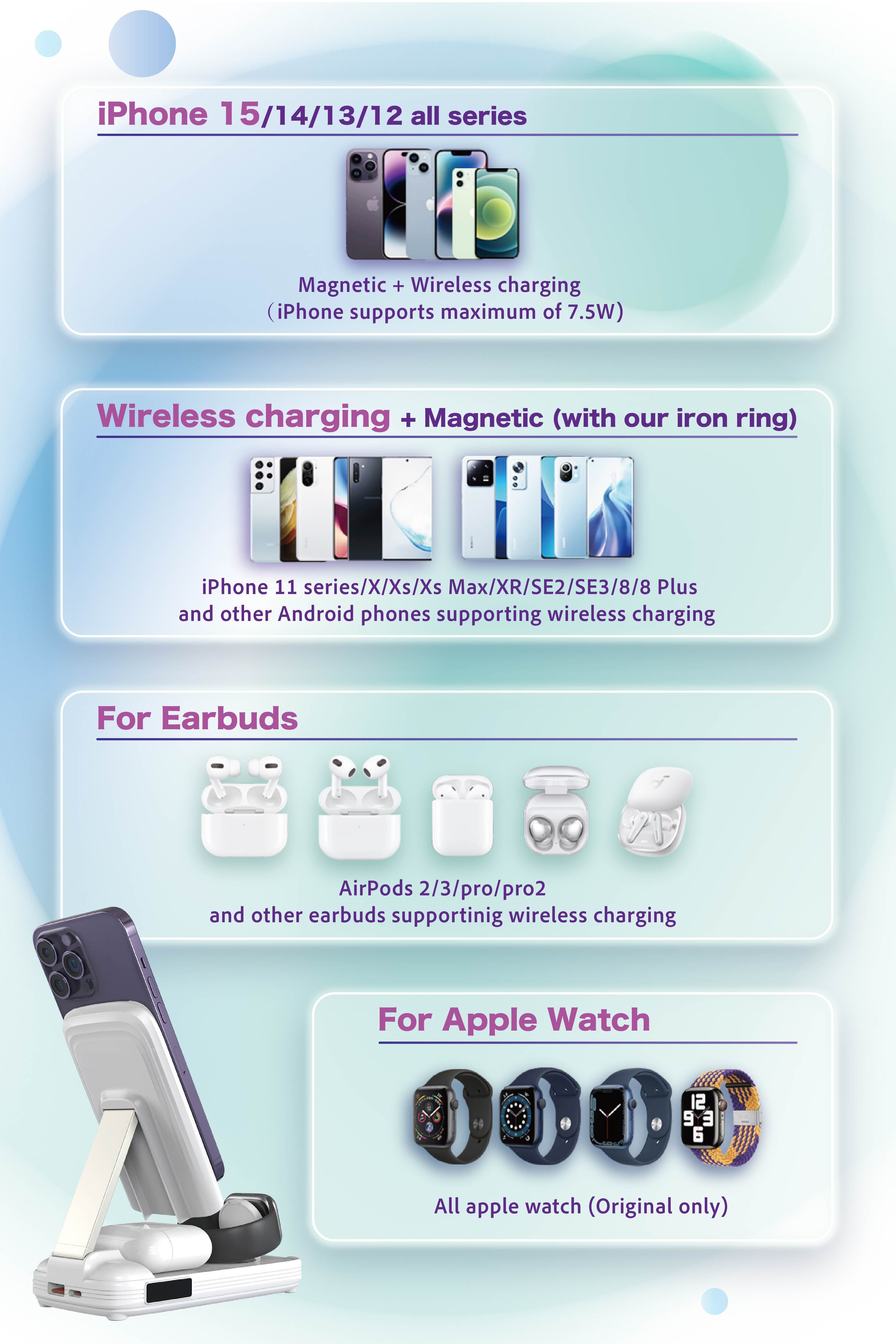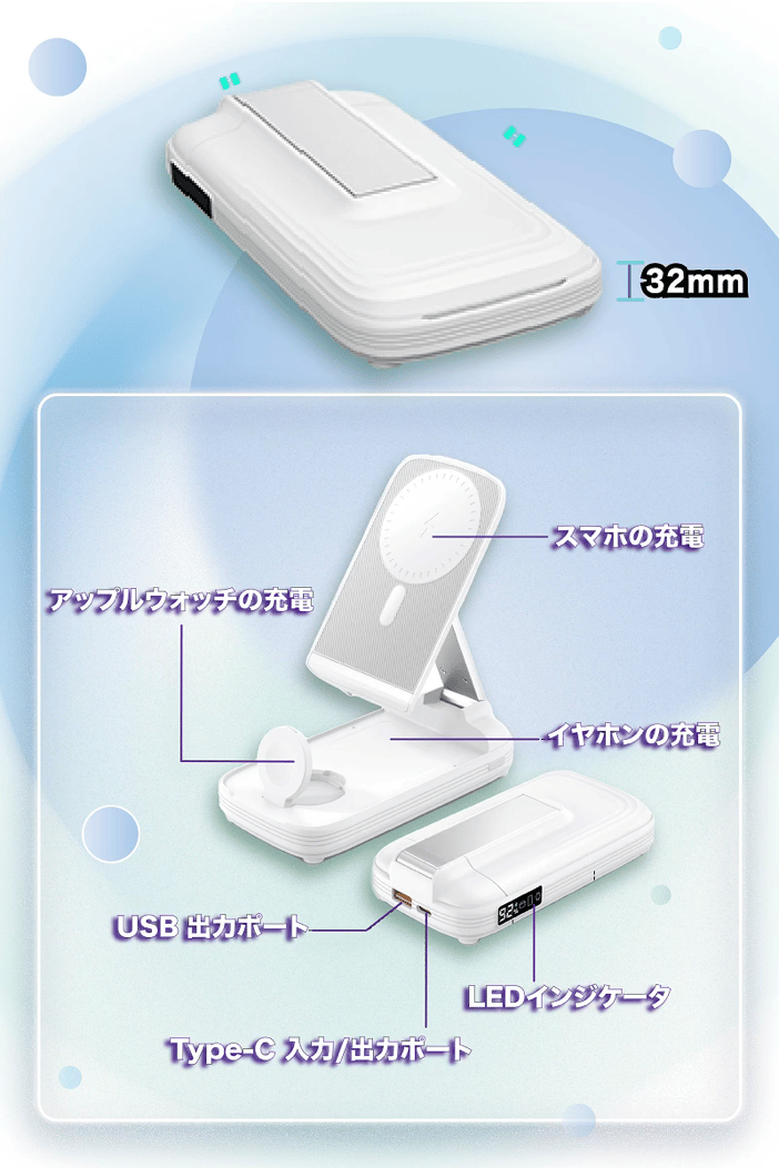 - iPhoneを始めとした、普段身に着けるウェアラブル端末であるAirpods、アップルウォッチを同時にワイヤレス充電できる便利なモバイルバッテリーです。