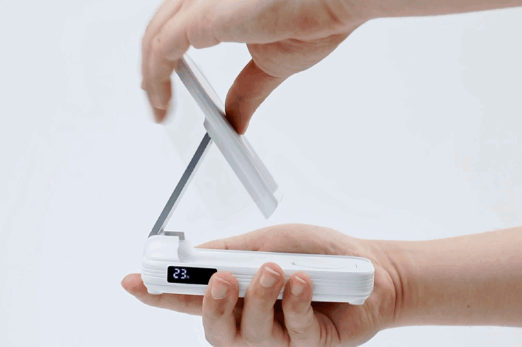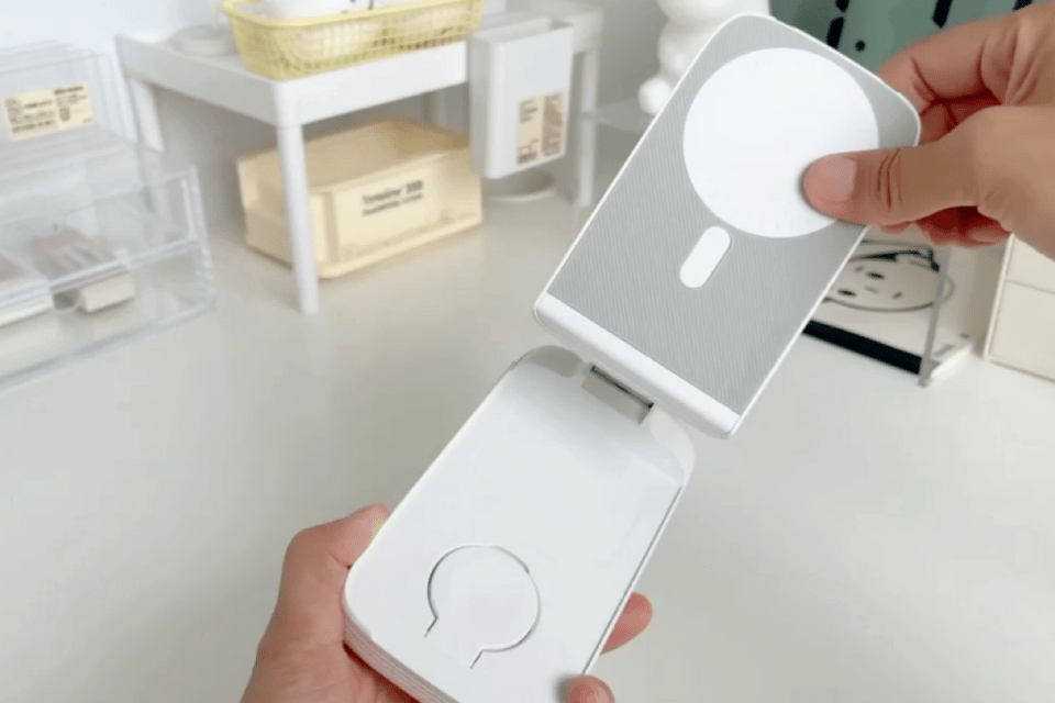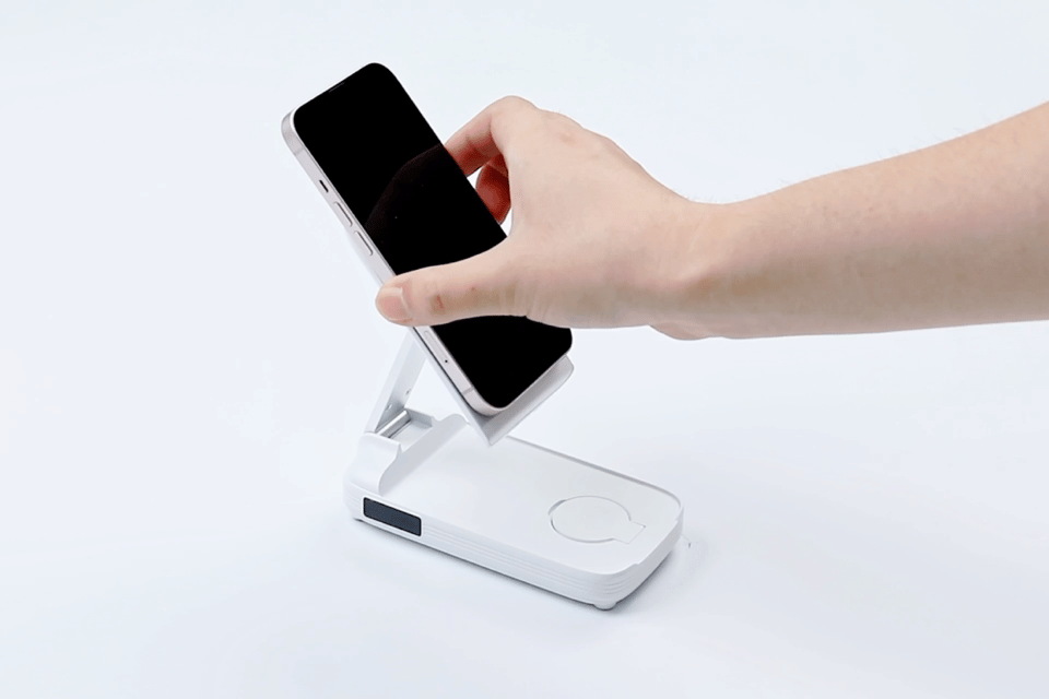 家ではベッドルームやリビングの充電器としてモバイルバッテリーを充電しながらお使いいただき、外出時、勤務時にはコンパクトに折り畳んで持ち歩くことでどこでも充電ステーションを使用することができます。