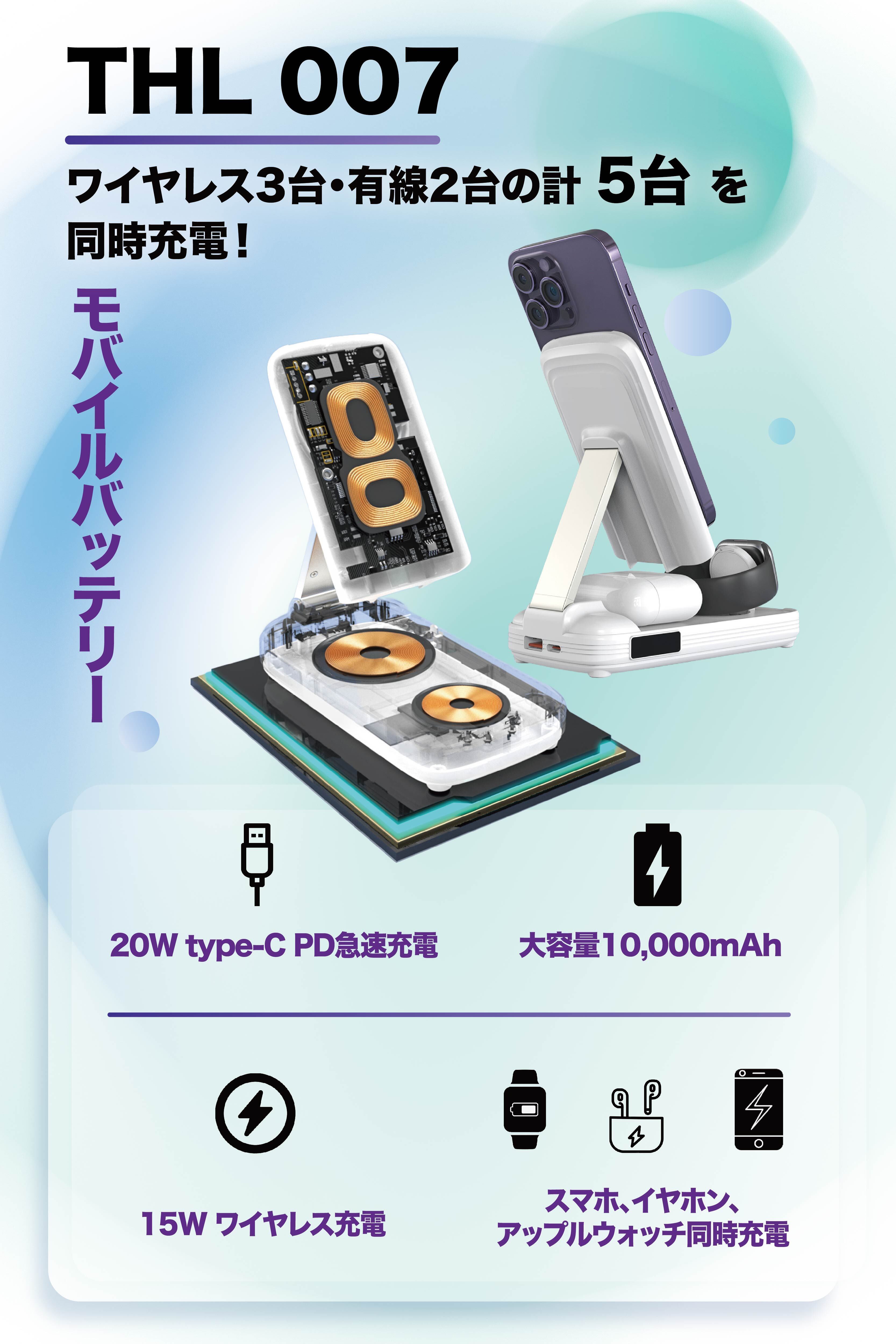 - THL007は、毎日使用する数多くの充電器をポケットサイズに凝縮したどこでも使用ができるモバイルバッテリーです。
