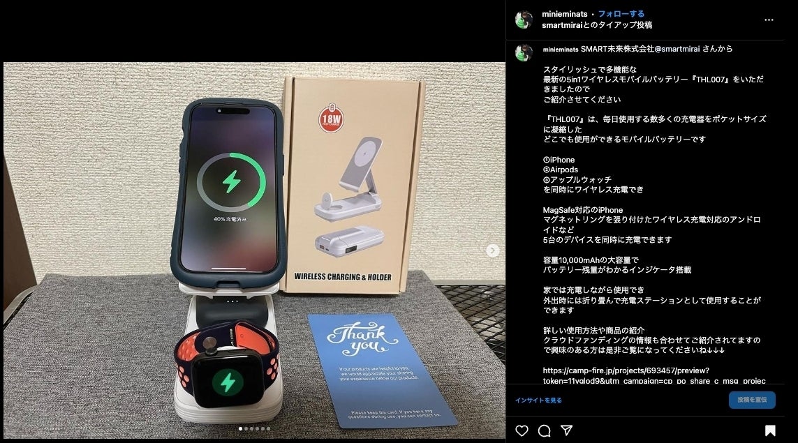 2023/09/11 10:58ご拝見いただき誠にありがとうございます。ついにTHL007のクラウドファンディング動画のTwitterインプレッション数が28,000件を突破!更に動画の再生数は6,800件の再生と非常にありがたい数字となってまいりました。その他サンプル提供させていただいておりますインスタグラマーの方々からもありがたいことに高評価を頂いております。一般的にスマートフォンのメーカーとウェアラブル端末を揃える方が多くiPhoneを使用している方はAndroid端末と違い特にApple製品で身の回りをまとめることで利便性が大きく向上します。しかし充電端子や充電方法が異なるため充電器が複数になったり、持ち歩くケーブルの本数が増加してしまいがちです。THL007はそんな悩みを解決する最先端のバッテリーです!家でも出先でもどこでも充電できるモバイルバッテリーは非常に便利です。通常、モバイルバッテリーはカバンに眠っていたり、いざ使おうと思って取り出したら充電がなかったりTHL007であれば家では就寝時にまとめてバッテリーと端末を充電、家を出る時に端末とまとめて持ち歩くことでいざというときにも安心です。いつも使用しているから忘れない!あらたなウェアラブルサポート端末として使用してみてください! もっと見る