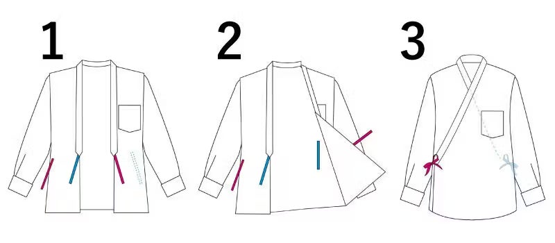 腰回りで留める二箇所の紐で調節することにより 伝統的なkimonoに比べ、締め付けが少ない快適な着心地を生み出します。