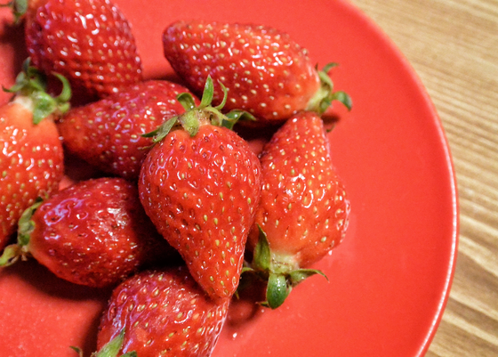 苺をのせて 今日の朝食のデザートに苺をゴロゴロ乗せて出しました。 赤いお皿に赤い苺、とってもキュートで子供も大喜び。 元気いっぱいの朝になりました。 RYOTA AOKI POTTERY 鈴木