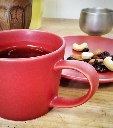 ほっと一息 忙しいお仕事中の合間に美味しいお茶で一息入れる時は、 落ち着いた色のワインレッドで。心も体も癒され落ち着きます。 ナッツやドライフルーツで栄養補給。 今日も一日頑張れそうです。 RYOTA AOKI POTTERY 鈴木