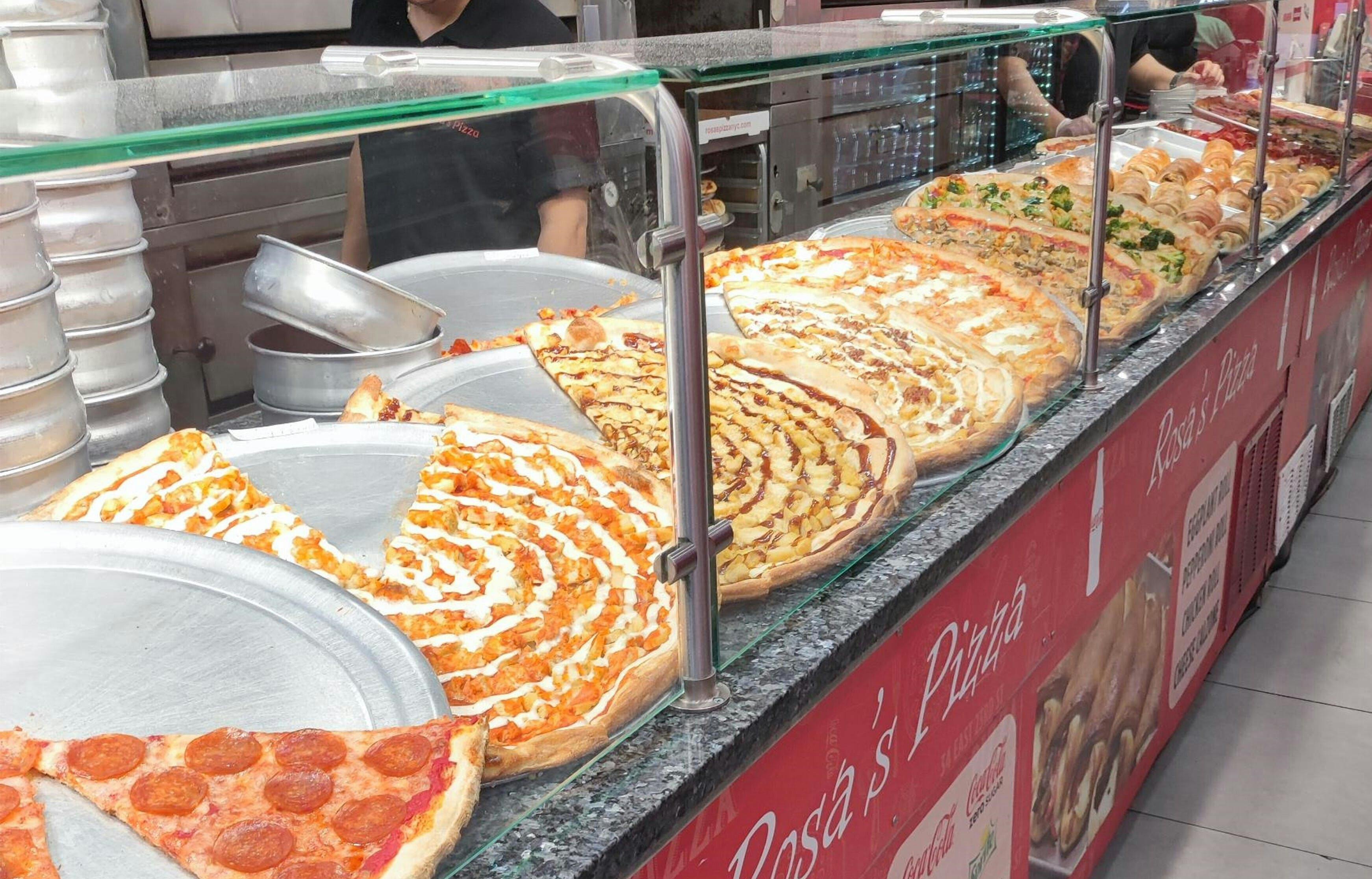 また、クリスピータイプの薄い生地で作られており、生地の上に薄いトマトソースの層を作り、その上にモッツァレッラチーズを振りかけるのが基本です。更にその上に様々な追加のトッピングが置かれます。ショーケースに並べられており、通常8ピースほどに切り分けられ、1ピース(スライス)毎テイクアウトするのが主流です。