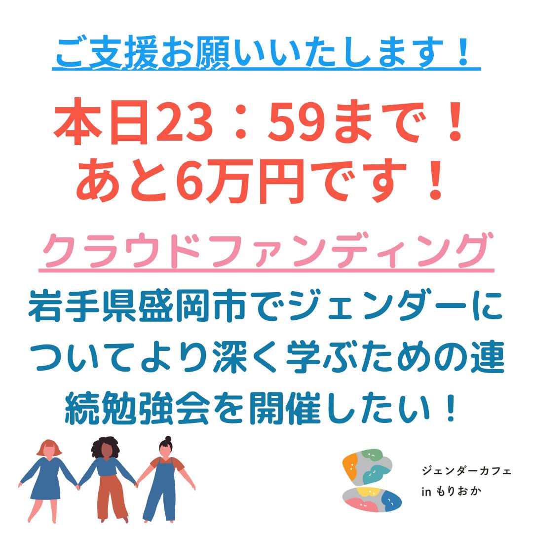 2023/09/16 10:07こんにちは! ジェンダーカフェもりおかです。私たちのクラウドファンディングの挑戦に、たくさんのご支援&応援をいただき、本当にありがとうございます。支援者の皆様からのメッセージに励まされながら最後の一日を迎えました。本日23:59までに、あと6万円を集めます。岩手でジェンダー平等を進めるために、 本プロジェクトの成功を目指して最後までがんばります。応援よろしくお願いします! もっと見る