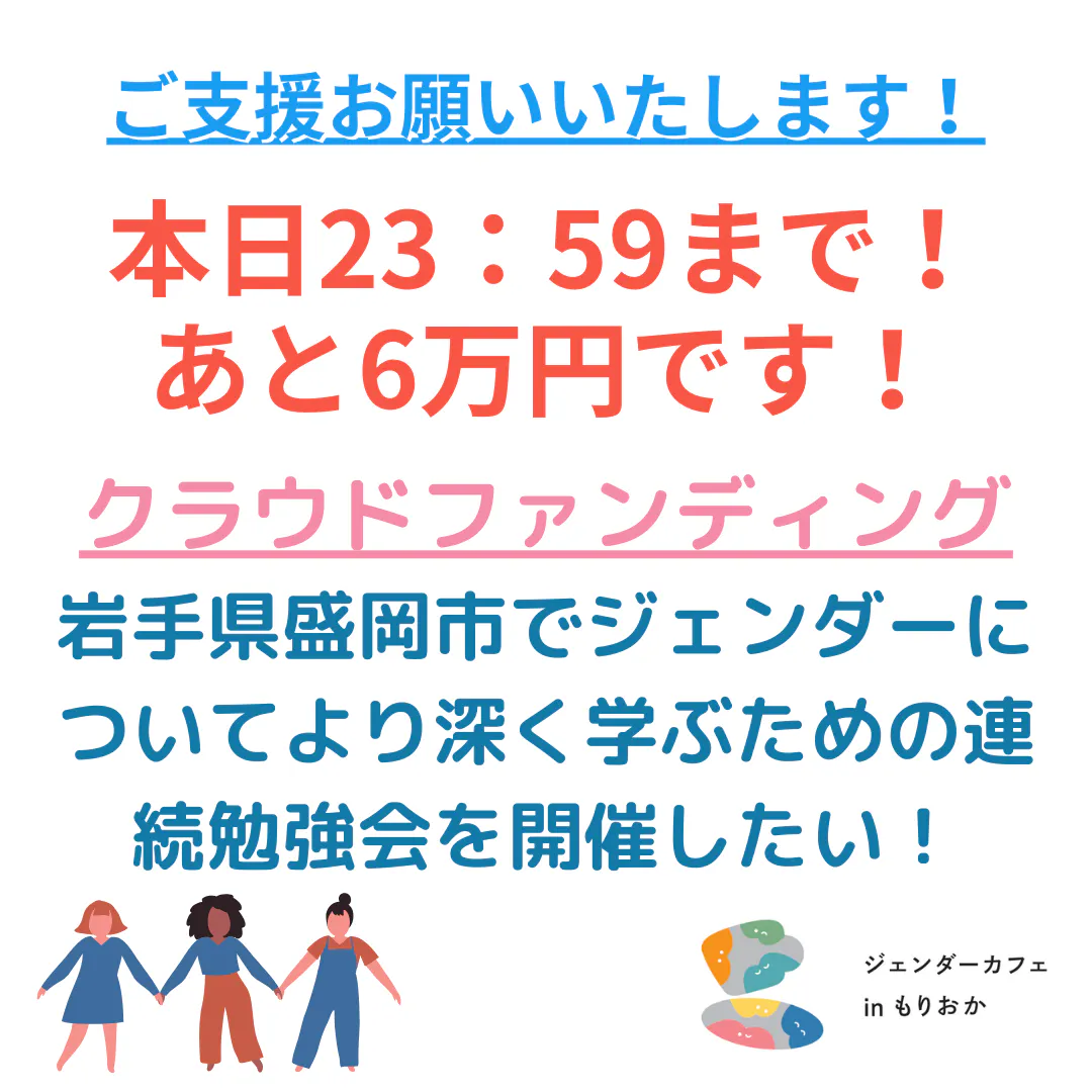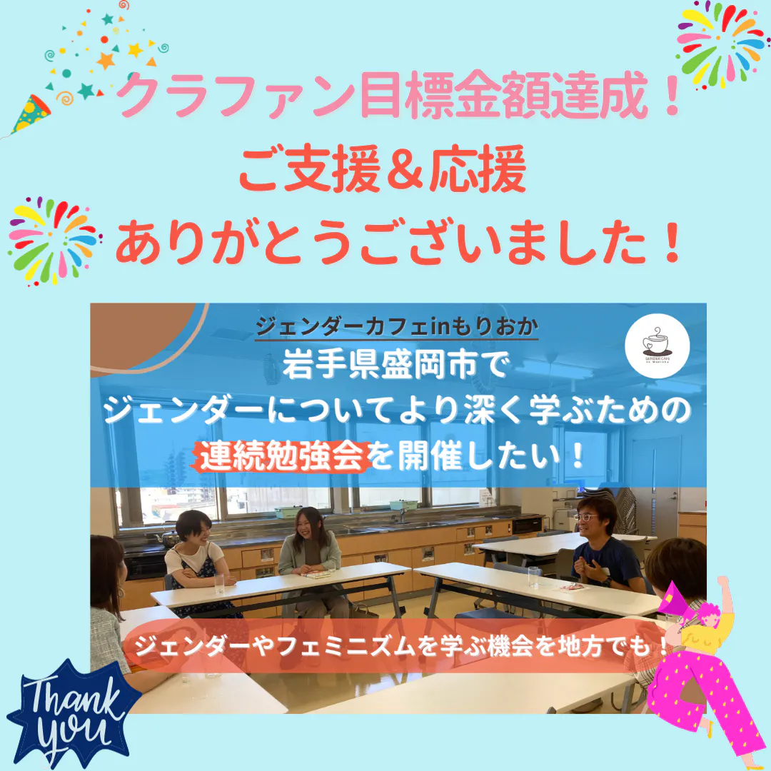 2023/09/17 09:27こんにちは!ジェンダーカフェinもりおかです。私たちのクラウドファンディングは昨晩、無事に目標金額を達成することができました!ご支援&応援してくださった皆様のおかげです。本当にありがとうございました。クラウドファンディングで活動資金を集めると決めたときには、本当に集まるだろうかと不安もありましたが、たくさんの方々からの応援を受けて、ここまで来ることができました。大都市ではない場所でも、みんなで集まり、ジェンダーやフェミニズムについて学ぶ機会はとても重要です。地方でジェンダー平等に取り組むことは想像以上に大変ですが、それでもあきらめずに、仲間と繋がり、楽しく活動を広げていきたいと思います。これからもジェンダーカフェinもりおかの活動に注目してください。そして、一緒に活動したいという人がいたらぜひご連絡ください!以下、皆様のご支援を受けて開催する連続勉強会のご案内です。連続で開催しますが、1回毎に興味のある勉強会にお申込みください。***第1回 フェミニズムの歴史や運動について知ろうhttps://wp.me/peR3AL-1c第2回 知っていますかLGBT/多様な性https://wp.me/peR3AL-1v第3回 性とからだに関する知識を身につける性教育が大事な理由を学ぼうhttps://wp.me/peR3AL-1I第4回 憲法24条はなぜ大切なのか-人権・ジェンダー平等・平和https://wp.me/peR3AL-1U***また、ジェンダーカフェinもりおかの情報は以下からもご覧いただけます。X(旧Twitter) https://twitter.com/moriokagencafeMastodon https://mstdn.jp/@moriokagencafeInstagram https://www.instagram.com/moriokagendercafe/改めて、ご支援いただきましたこと、心より感謝申し上げます。これからもどうぞよろしくお願いいたします。 もっと見る