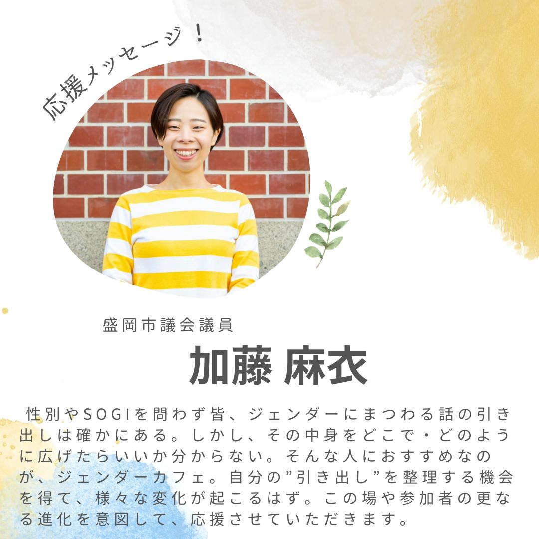盛岡市議会議員の加藤麻衣さんより応援メッセージが届きましたので、ご紹介します。