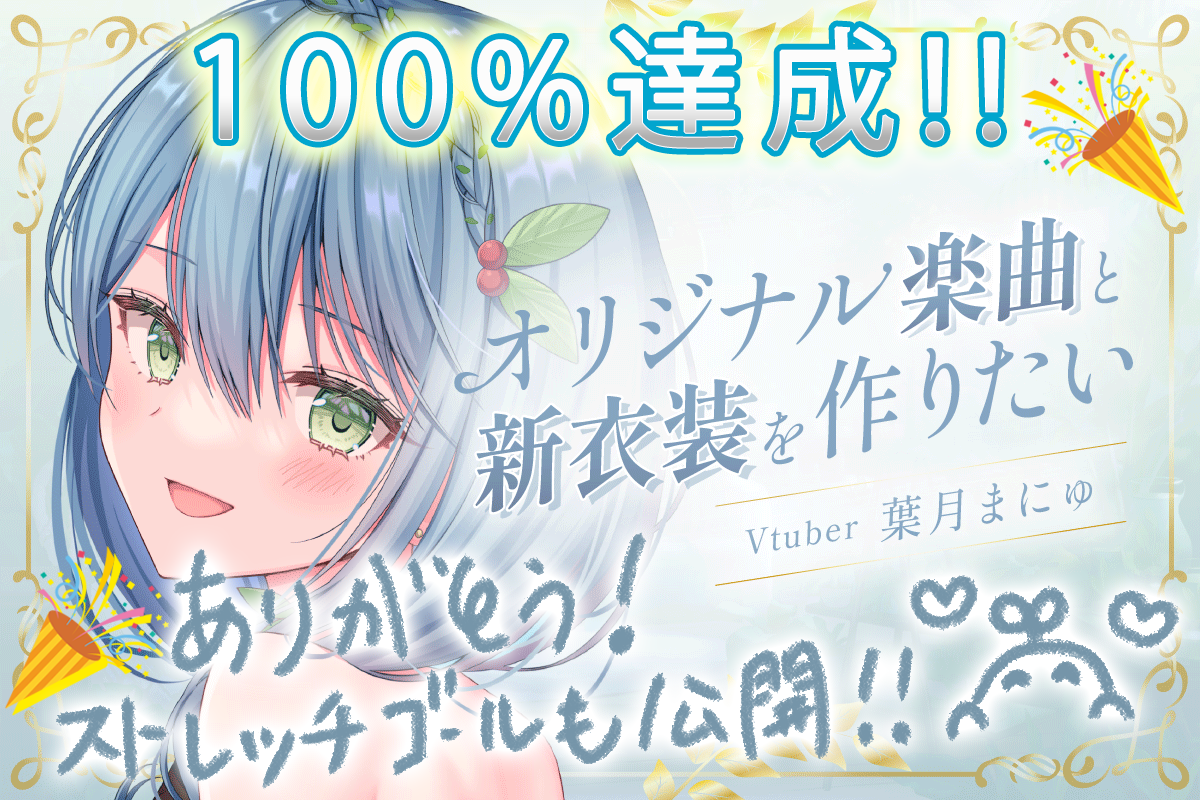 怒涛の駆け込みで、無事目標金額の150%を達成しました!!本当にありがとうございます!!配信中にストレッチゴールもお知らせしましたが、こちらにも掲載させていただきます!✧ 155万円 ✧新衣装オルタバージョンの制作!ママにカラー変更の許可をいただき、今回新衣装のオルタ版(2Pカラー版)を制作します!どんなカラーリングにするかは、みんなと配信で相談したいです。✧ 165万円 ✧いずもねるママに、今回の新衣装のキービジュアルを描いていただきます! 3000円以上のプランについている「サンクスカード」に 印刷しようと思います。✧ 180万円 ✧特製まにゅーざーぬい(まにゅち用)とまにゅちが、 二泊三日の温泉旅行に行きます!後日、温泉旅行の様子を収録した動画や写真をアップします!✧ 200万円 ✧今回のオリジナル楽曲のアレンジ版を制作します!詳細は活動報告や配信や各SNSで!✧ 220万円 ✧上記のアレンジ版のオリジナル楽曲用のMVを制作します!Youtubeで公開予定です。お楽しみに!上記全て達成ということで…みなさん、ご支援本当にありがとうございました!これからも応援のほど、どうぞよろしくお願いいたします!!