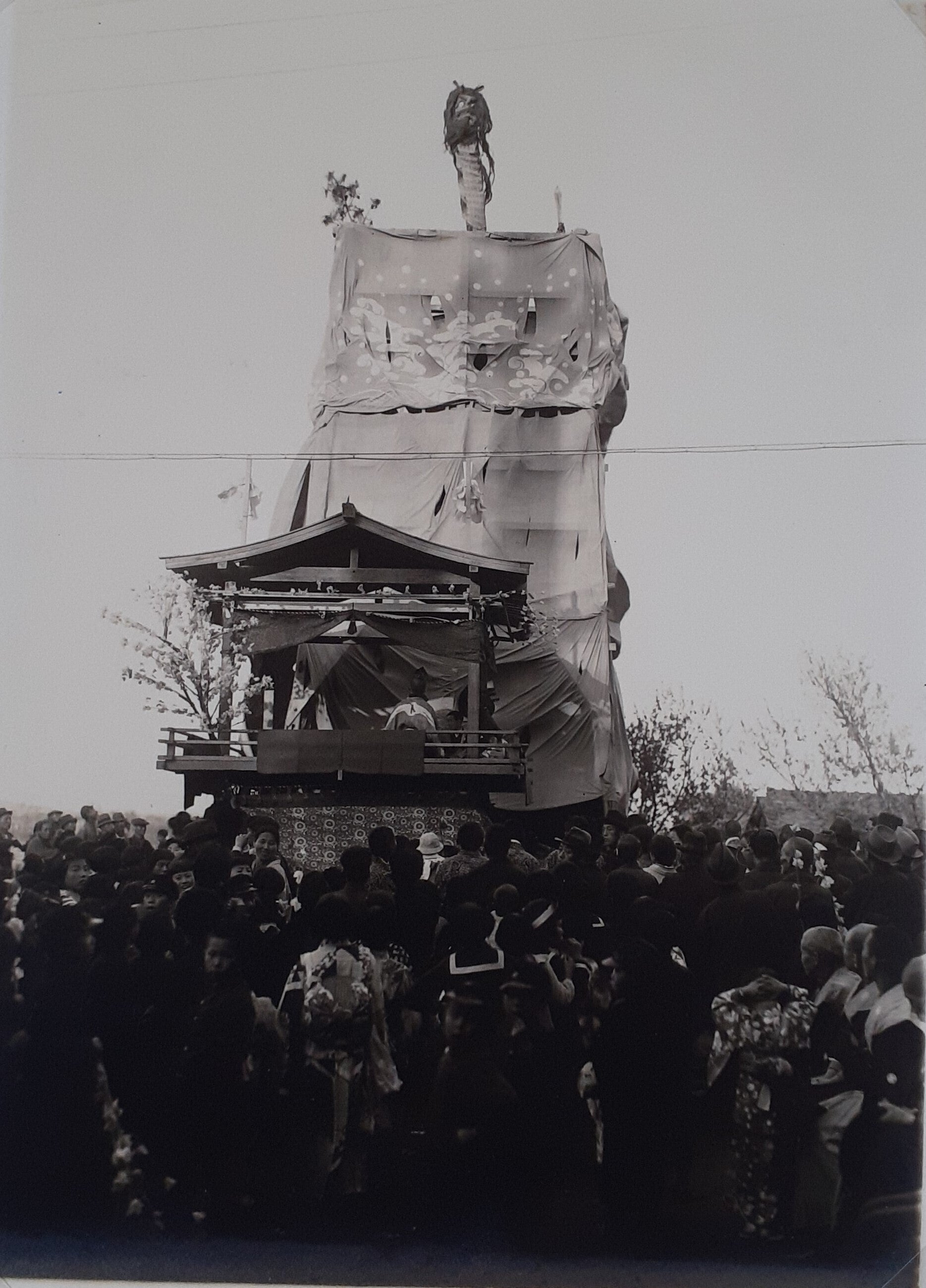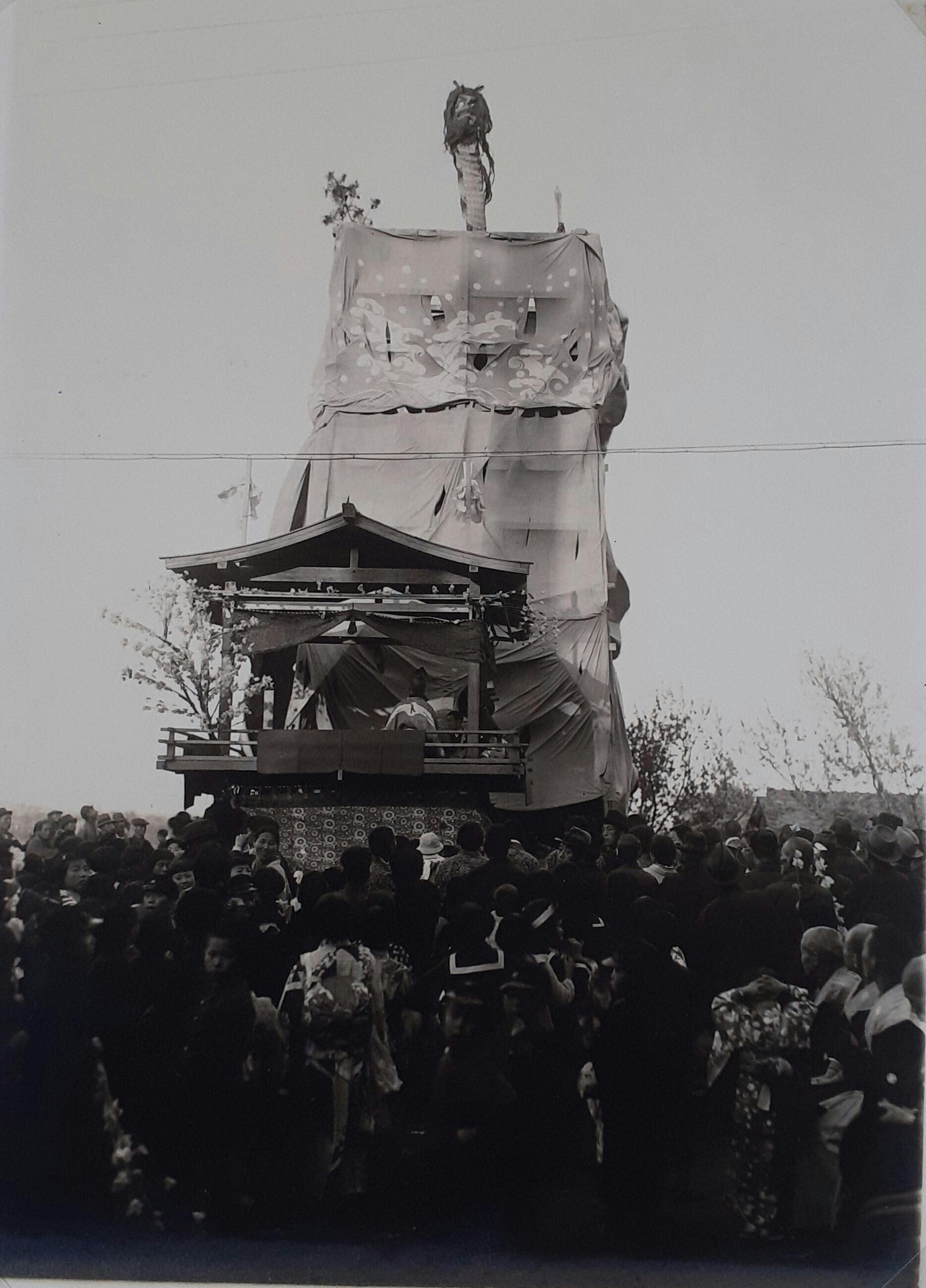 〇神輿渡式 神輿三基(御本社・高山神社・樹下神社)当神社摂社御旅神社(不破郡府中村にありて元当神社の鎮座地なり)へ渡御、還幸の際、市場野に(当神社飛地境内)駐輿薄暮還幸あり。祭典は中祭式なり。市場野に於て、蛇山と称する物を組立高さ六間三尺周囲九間余、周囲に幕をめぐらし、蛇山の頂上中央に蛇頭を置き、神輿此前を通過のとき、蛇頭を上下四方に動揺す。此蛇山に車楽を連接し、神輿此處に駐輿のとき、車楽上にて左の舞踊をなす。