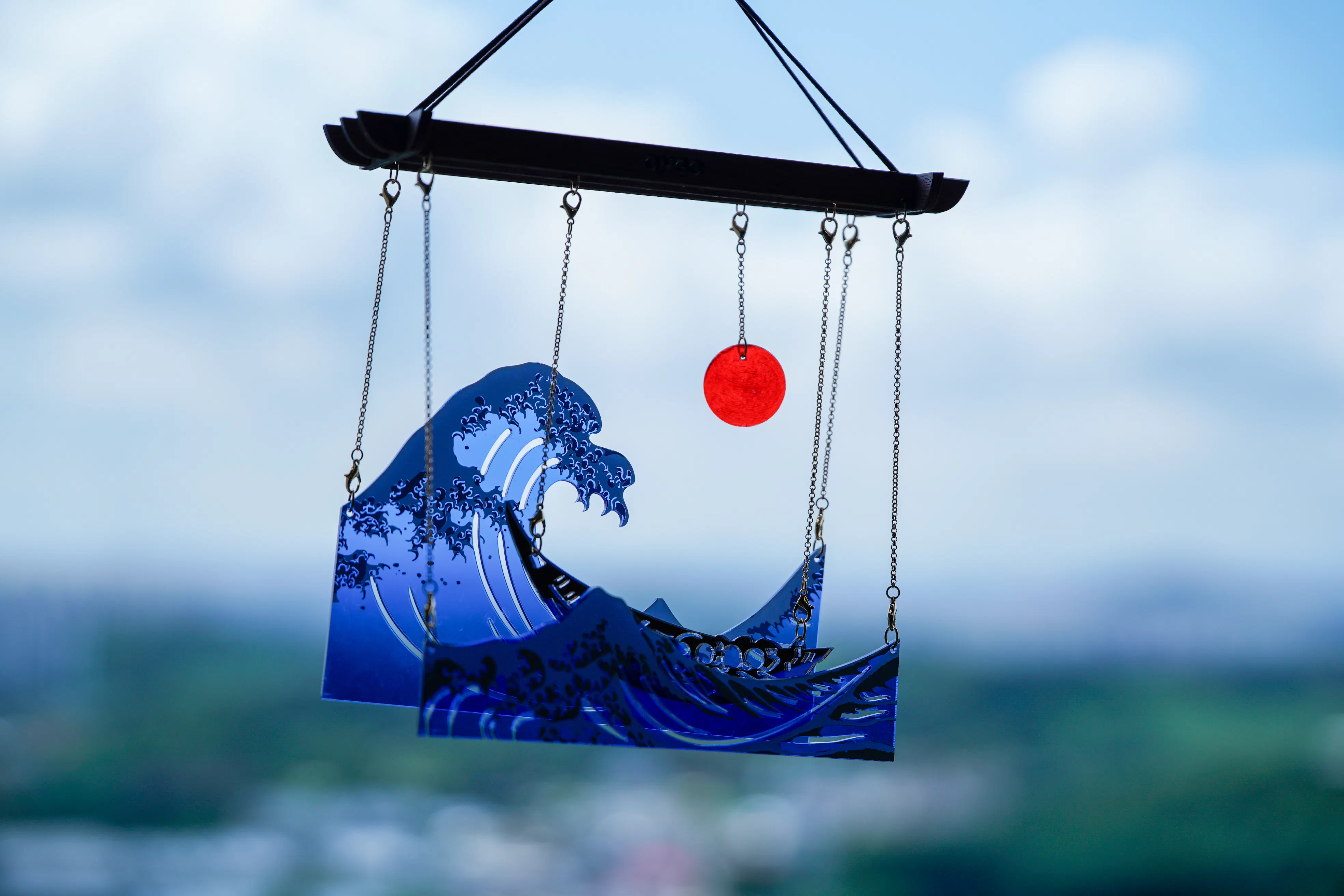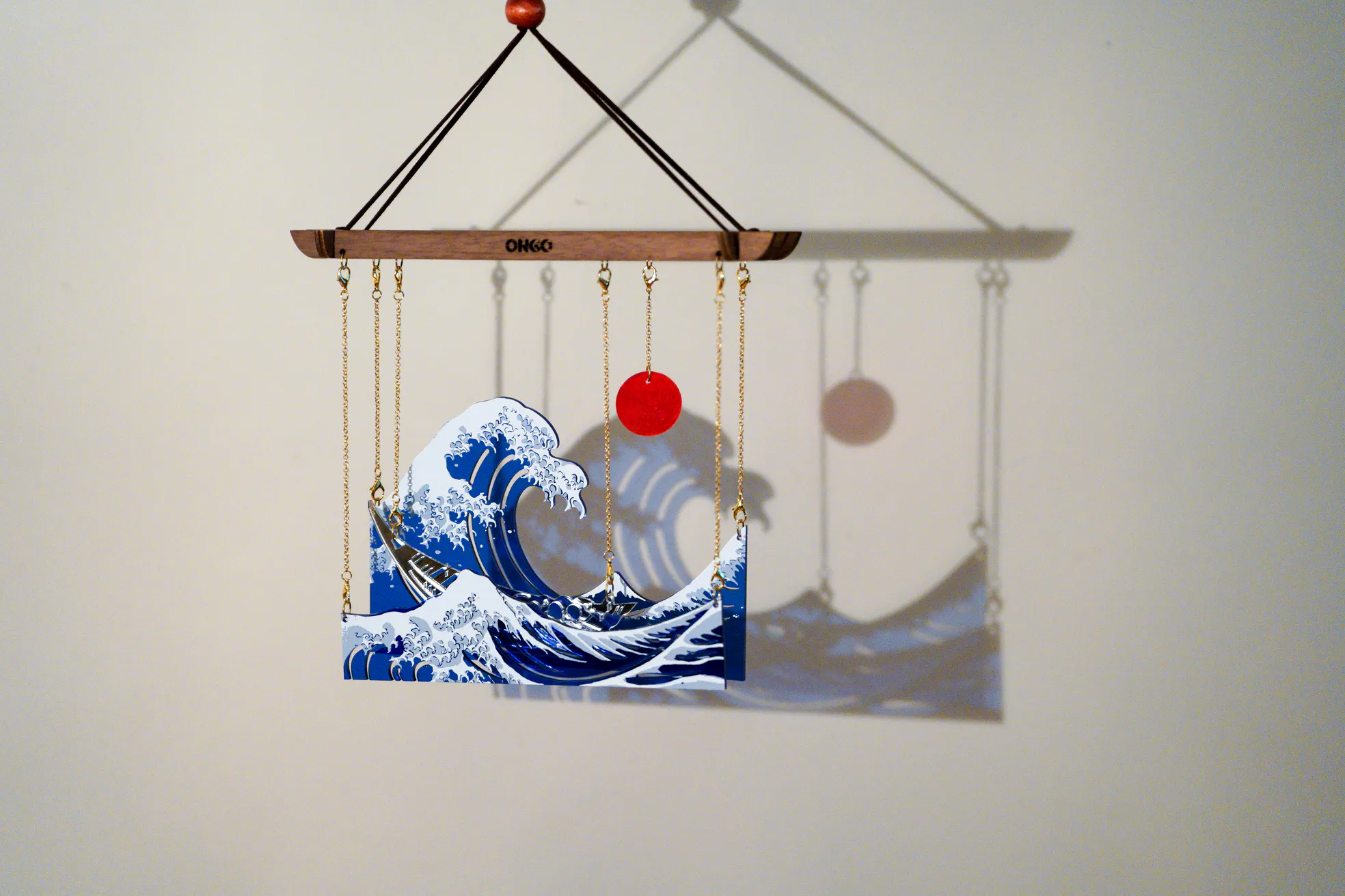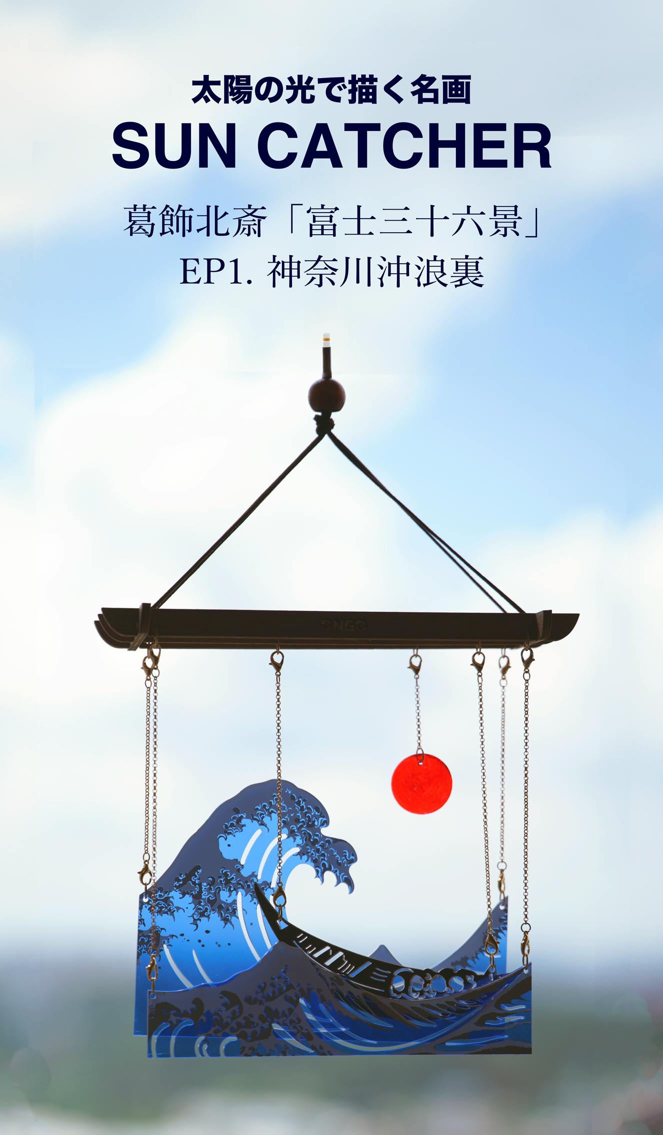 Stained Glass(ステンドグラス)の如く、太陽の光を透過して作品を表現するオブジェである「Sun Catcher(サンキャッチャー)」は、北斎が表現した神奈川の荒れた大波と、その波を克服する人々、そして富士山を空間に照らします。