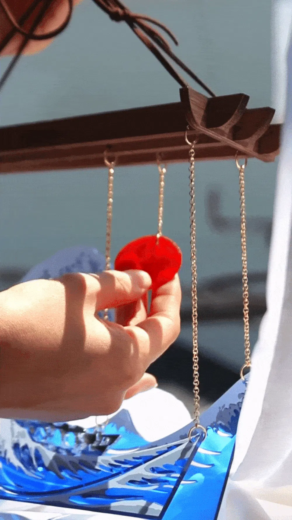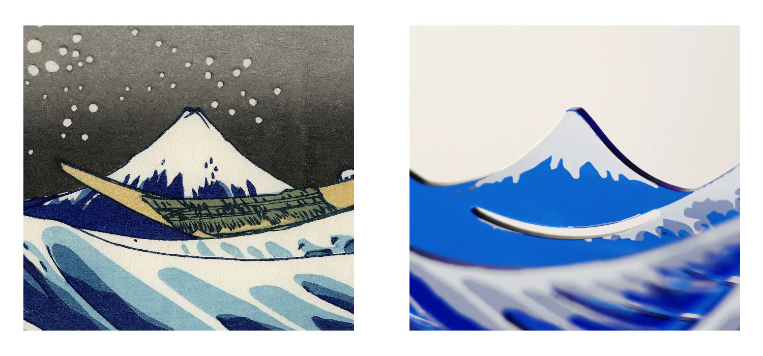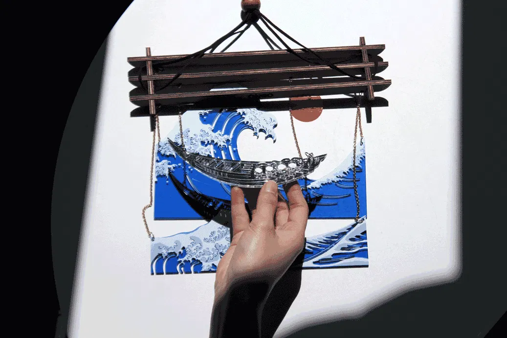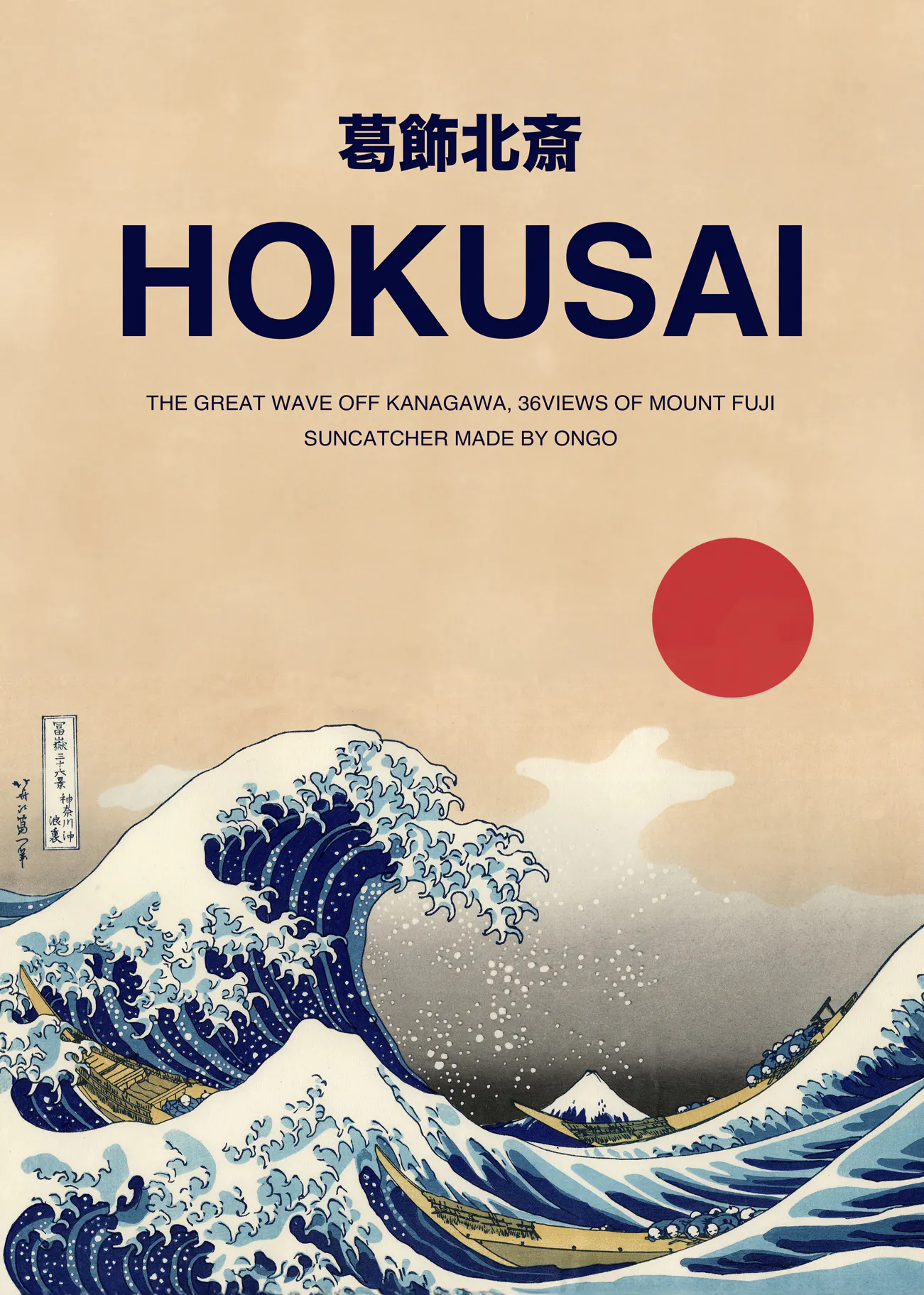 Stained Glass(ステンドグラス)の如く、太陽の光を透過して作品を表現するオブジェである「Sun Catcher(サンキャッチャー)」は、北斎が表現した神奈川の荒れた大波と、その波を克服する人々、そして富士山を空間に照らします。