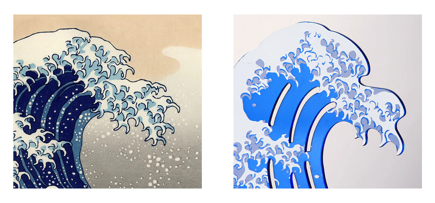 「鋭い爪のような荒れた大波」- 今にでも全てを飲み込めるような「大波」を表現しました。全てを切り裂くような猛獣の爪の如く、猛烈な波の爪のディテールを活かし原作がもたらす強烈な印象を伝えられるようにしました。