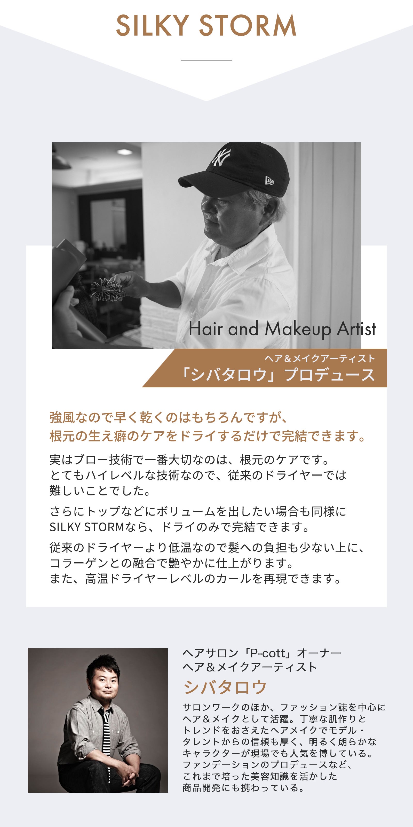 SILKY STORMは、サロンワークの他、ファッション誌を中心にヘア&メイクアーティストとして活躍されている「シバタロウ」プロデュースの新感覚ヘアドライヤーです。
