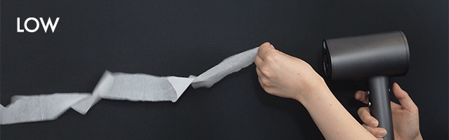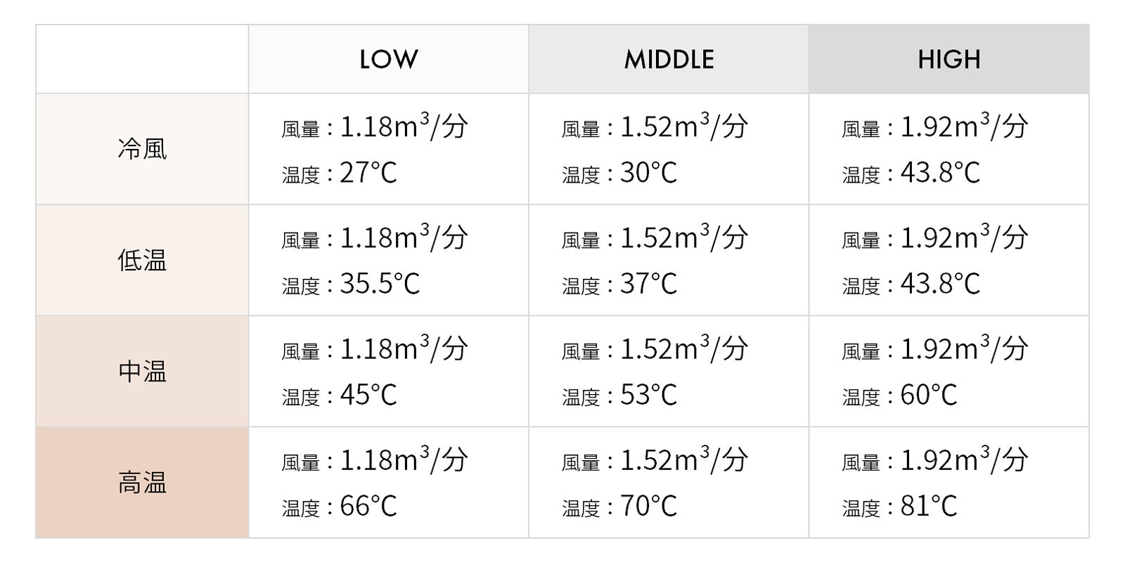 風量は、LOW(弱)・MIDDLE(中)・HIGH(強)の3モードから選択できます。さらに!髪質に合わせて、冷風・低温・中温・高温の4モードから温度の調整ができます。