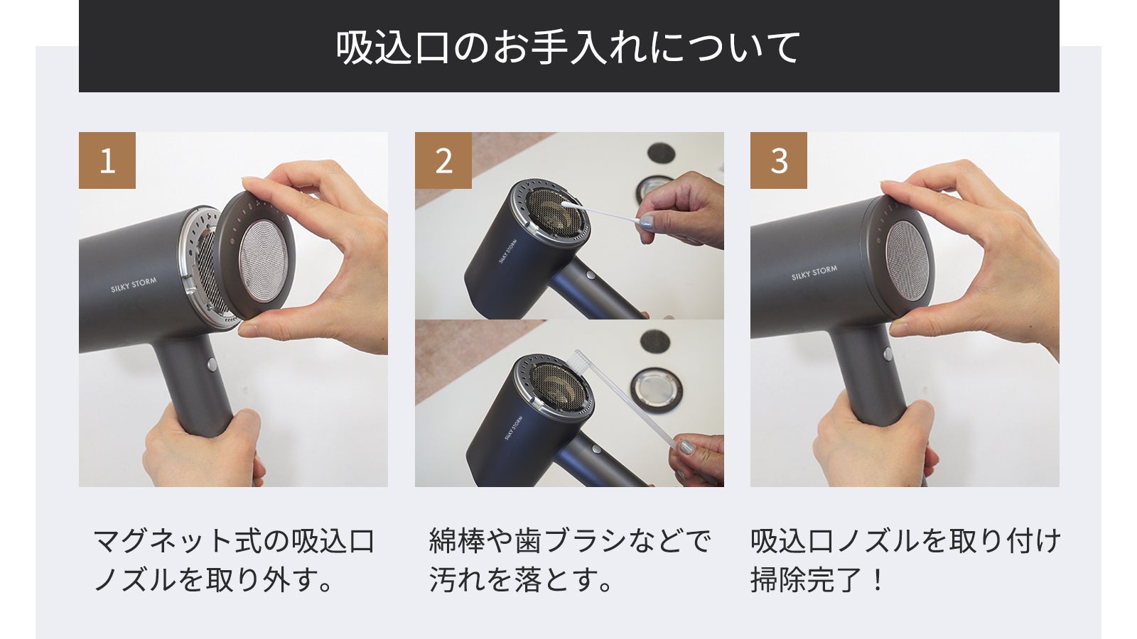 業界最高クラスの技術力で「大風量」「コラーゲン」「低温」にこだわり、「風の強さ(STORM)」と「つややかで繊細な仕上がり(SILKY)」を実現しました。