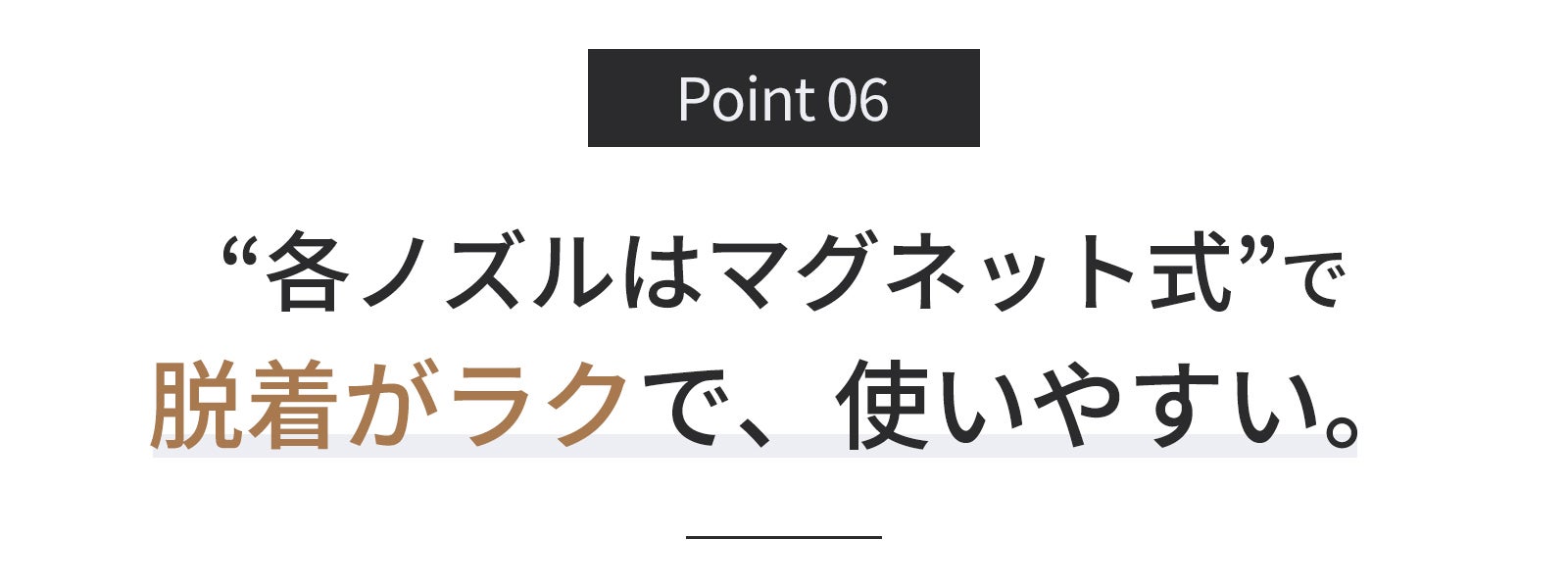 スタイリングノズル・エアシャワーヘッド・吸込口ノズルはマグネット式を採用しています。360度回転できるので、お好みに合わせて簡単に風向きを変えることもできます。
